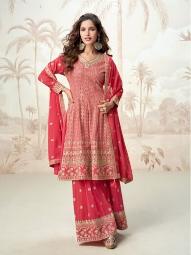 Brick Red Sequin Embellished Chinon Suit Set Style · Sequin Machine Work · Notch Neckline · Palazzo · Set of 3