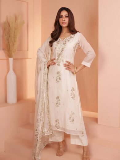 Beige Floral Embroidered Chanderi Silk Kurta With Embroidered Trousers & Organza Dupatta | Thread Work 3-Piece Set