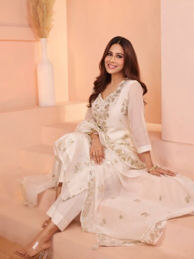 Ivory Pure Mul Chanderi Kurta Set Mul Chanderi · Metallic Thread & Floral Embroidery · Shantoon Pants · Set of 3