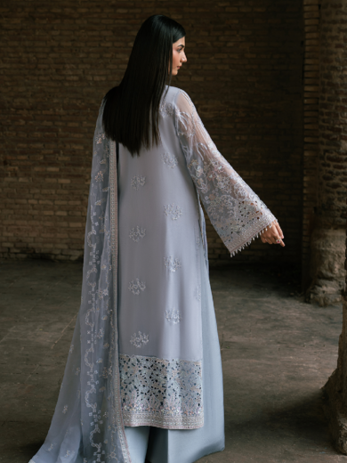 Baby Blue Embroidered Chiffon Three-Piece Stitched Collection | Premium Organza Border & Dyed Trouser