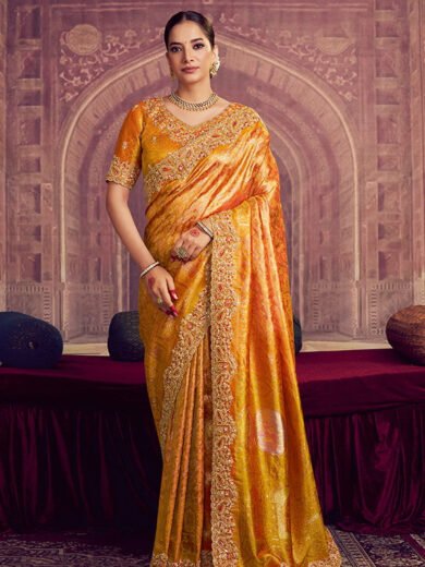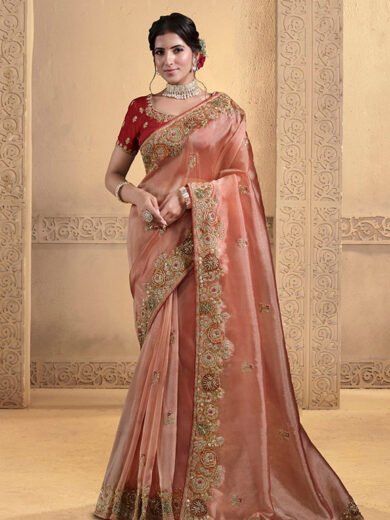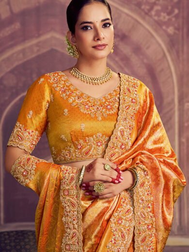 Orange Pure Twill Tissue Saree with Khatli Work & Sequence Pure Twill Tissue · Khatli Work · Sequence · Viscose Silk Satin Blouse