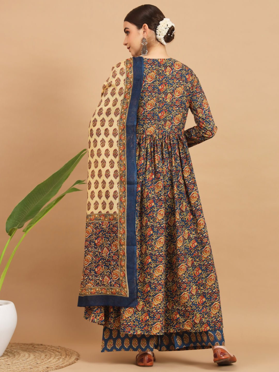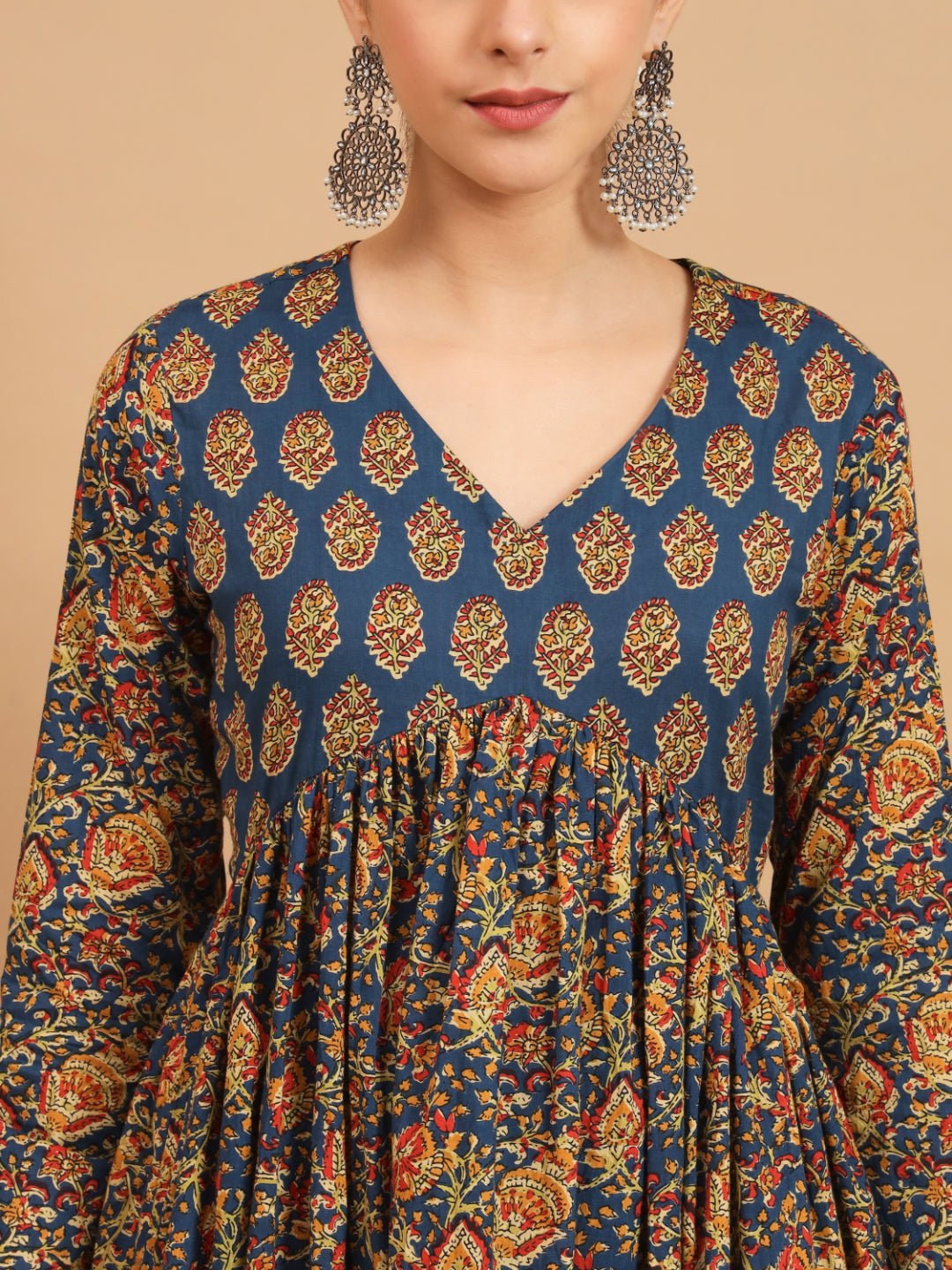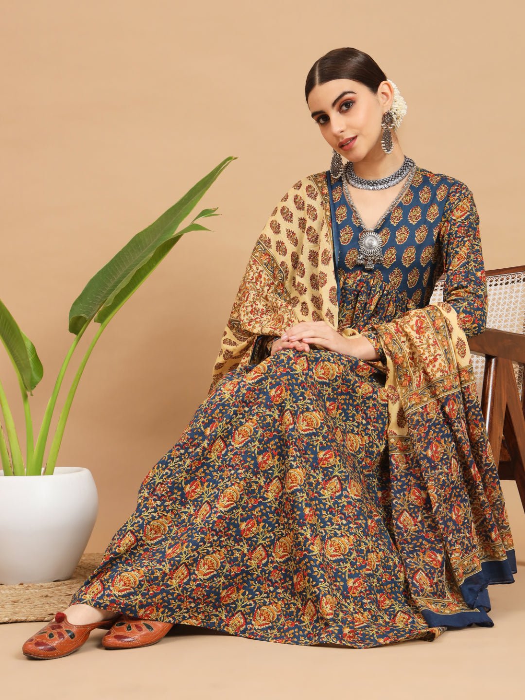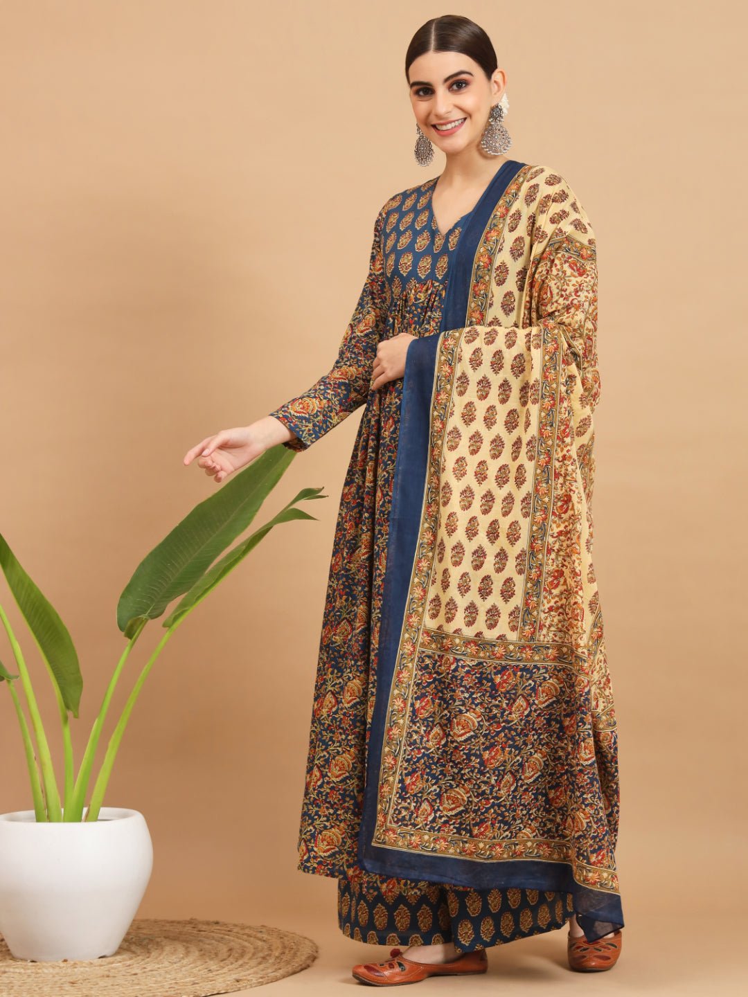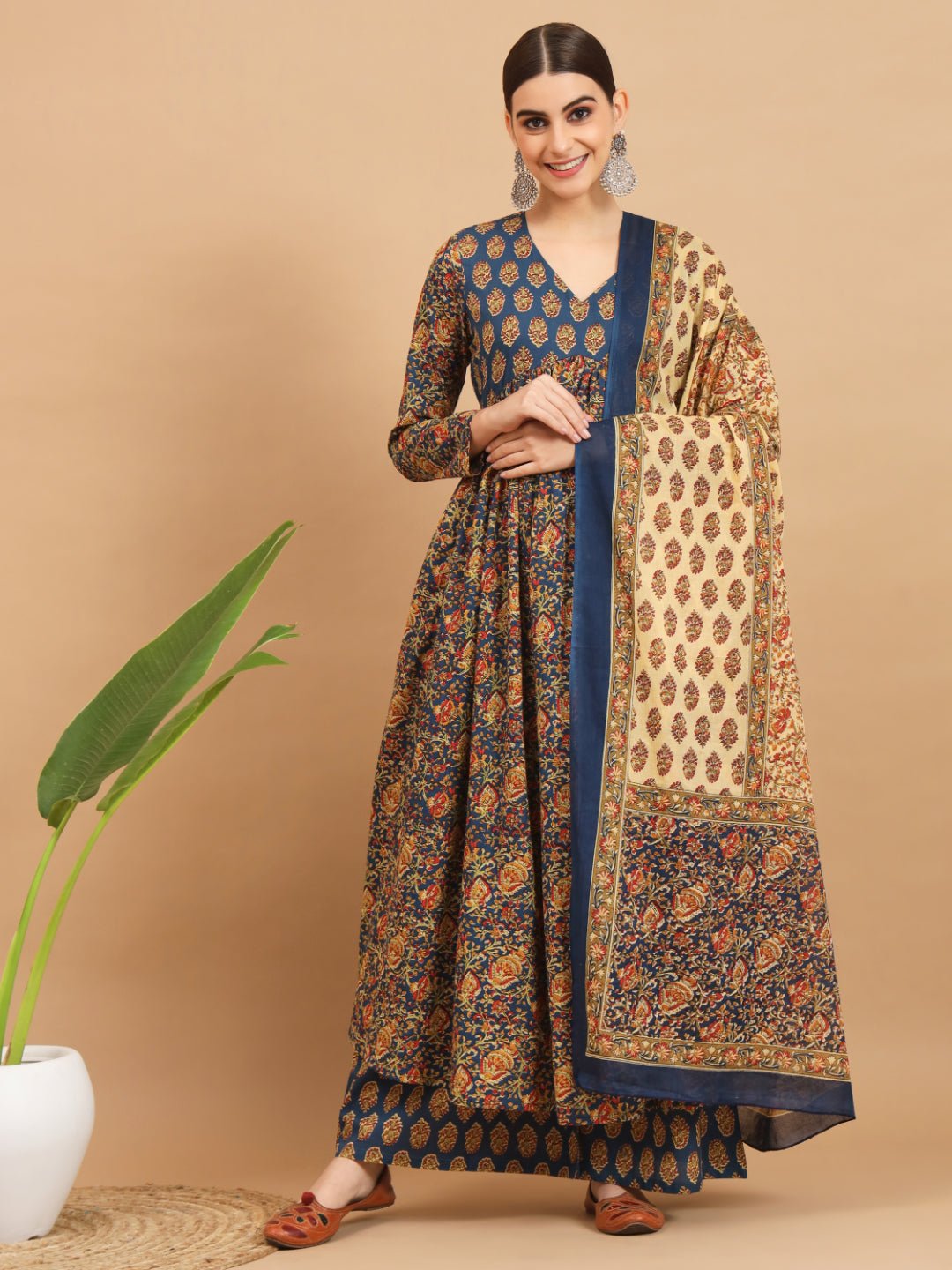 Aqua and kalamkari is a pairing that earns its keep — the vivid heritage print reads differently against a cool, clear blue-green base, and the flared silhouette gives the pattern room to travel as the fabric moves. Built from breathable cotton with a V-neckline and full sleeves, this set is festive enough for a party and considered enough for a cultural occasion. The knee-length 49-inch cut is generous without being formal, the pockets are genuine rather than decorative, and the dupatta completes the three-piece with the same kalamkari language running through the whole look.