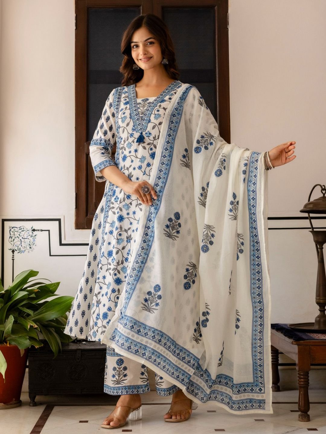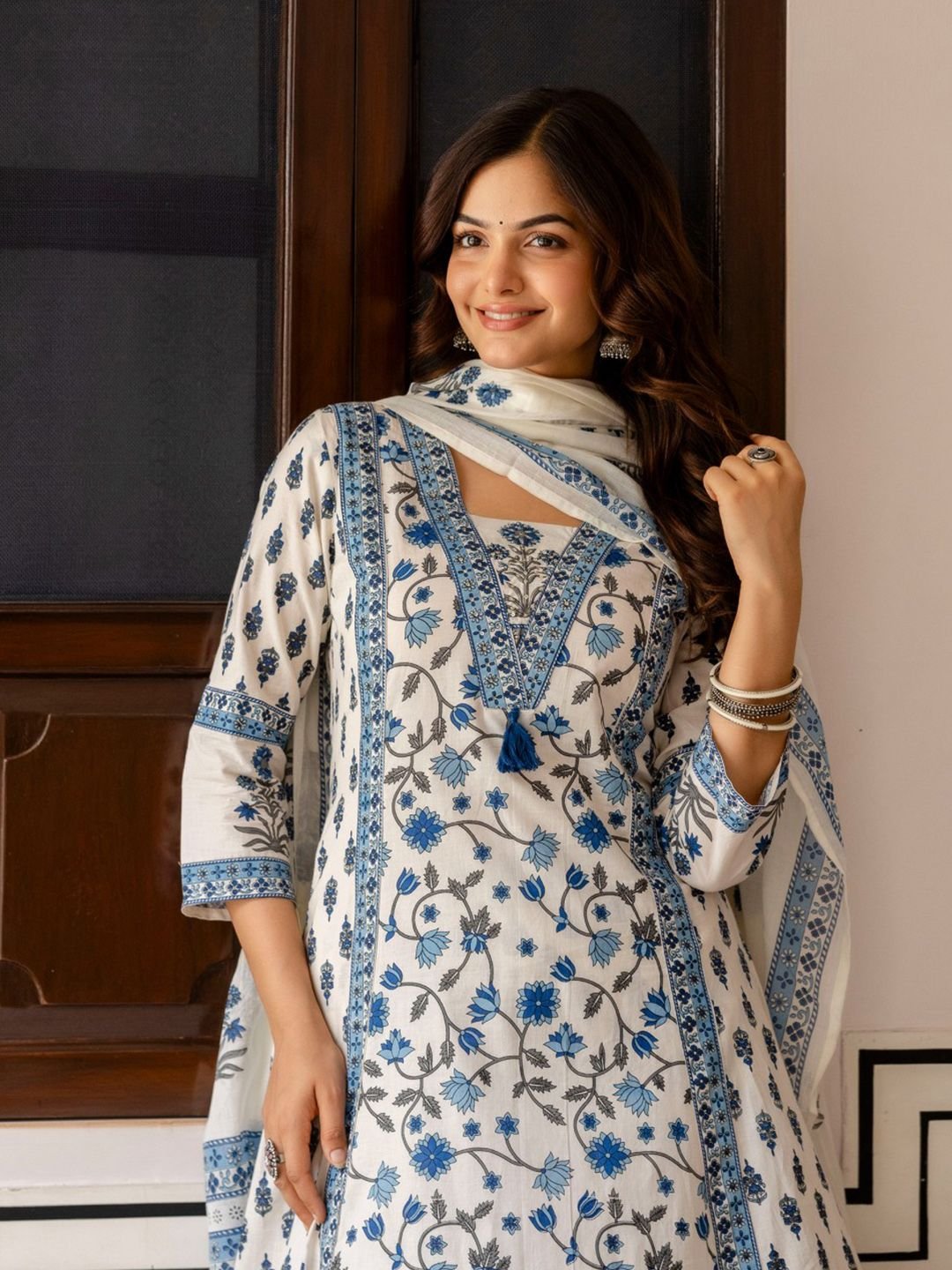 Beige with a blue floral print is a pairing that rewards the restraint — the warm neutral lets the blue travel across the fabric without competition, and the overall effect reads as considered rather than loud. The A-line flared silhouette opens above the knee from a clean V-neckline, three-quarter sleeves keep the coverage balanced, and the sequin ornamentation at the yoke and border provides the festive element. Pure cotton throughout — kurta, palazzo, and dupatta — all machine washable.