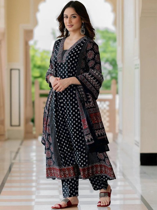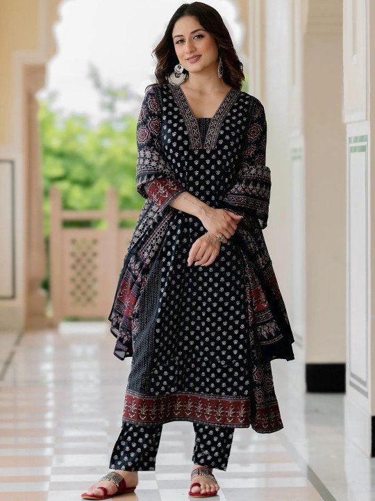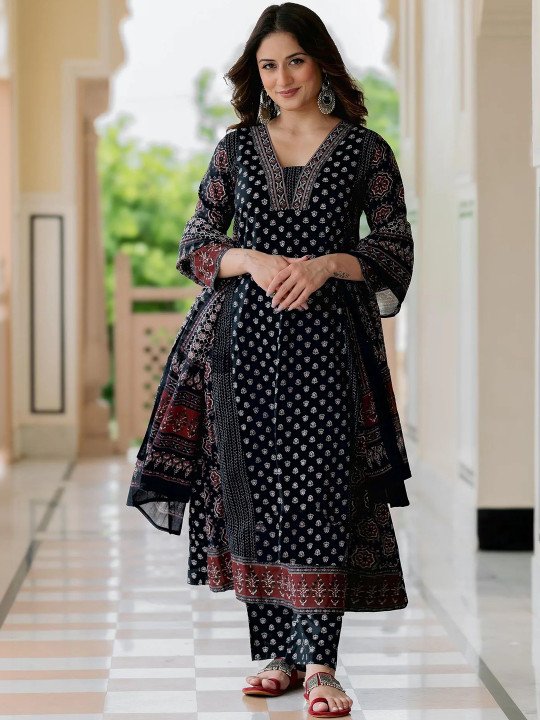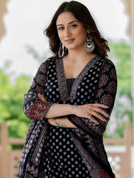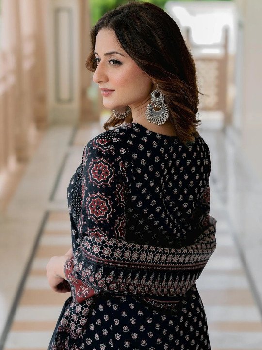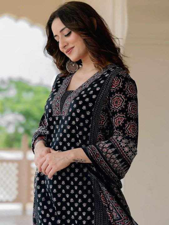 Make effortless style your signature with this stunning Black Printed Three-Piece Kurta Set — a beautifully crafted ensemble that seamlessly blends timeless ethnic artistry with modern, contemporary design. Rich, bold, and undeniably elegant, the deep black base adorned with intricate ethnic motif prints creates a look that is versatile, sophisticated, and perfect for virtually every occasion — from festive celebrations and cultural gatherings to casual outings and formal events.
