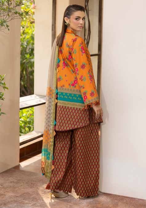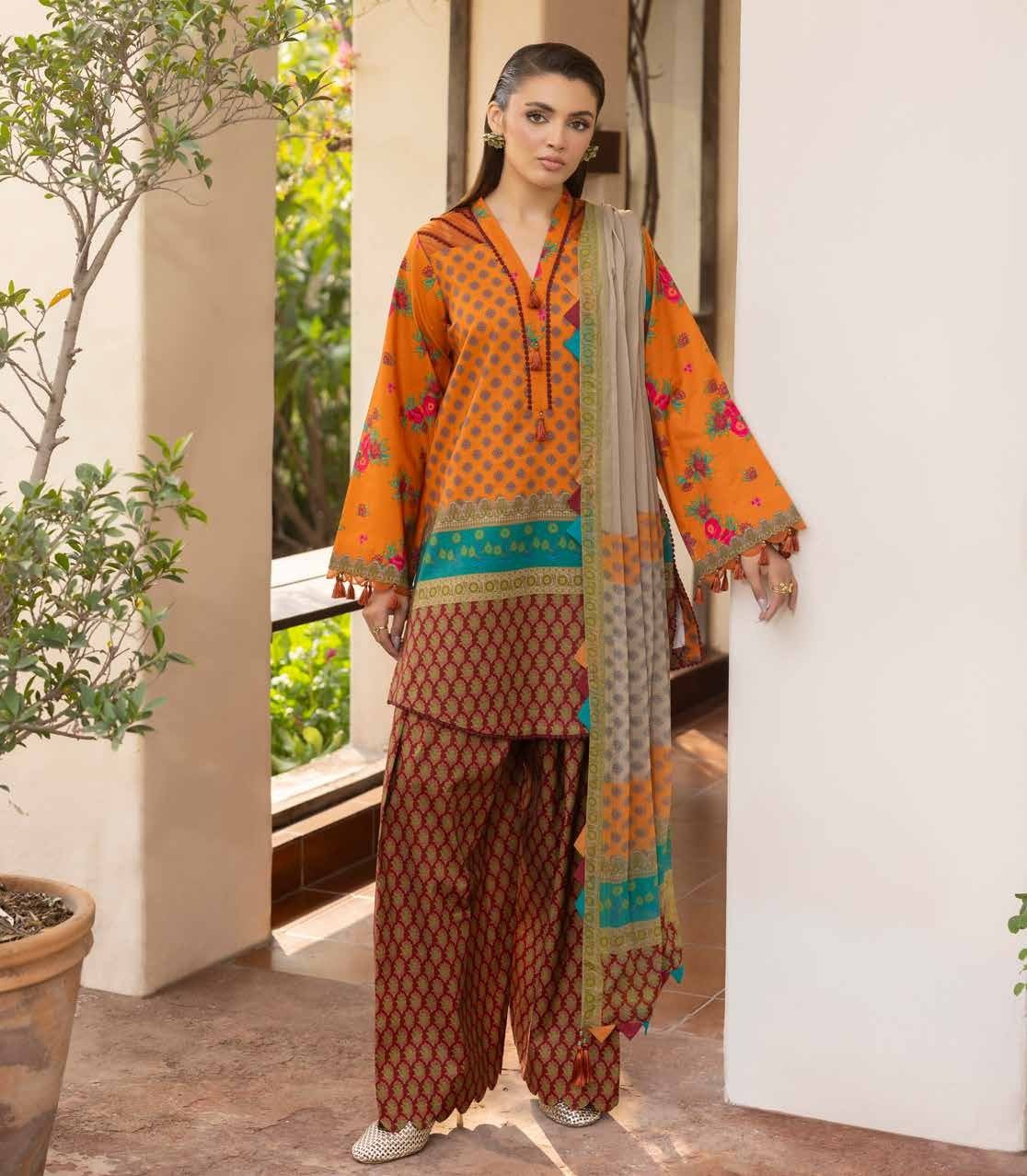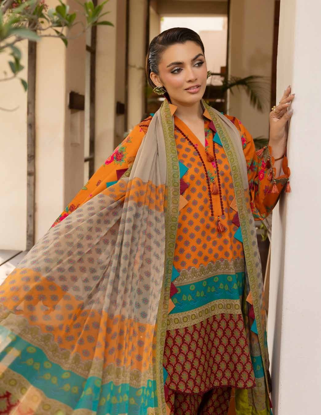 Orange in a printed lawn ensemble is a seasonal statement that works without effort. Charizma’s C Print Collection takes the coordinated print approach — the same print runs through the front, back and sleeves so the garment reads as a single considered look rather than assembled pieces. The printed cotton trousers carry the same language downward, and the printed chiffon dupatta finishes the three-piece with the lightness that chiffon always brings. Breathable, movement-friendly, and built for long occasions.