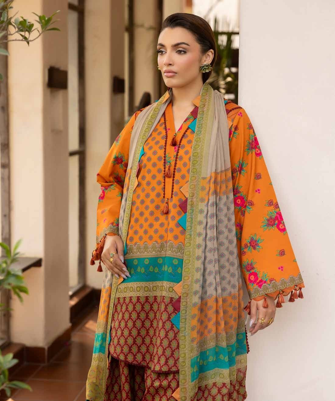 Charizma C Print Collection — Orange Printed Lawn 3-Piece Printed Lawn · Cotton Trousers · Chiffon Dupatta · Orange