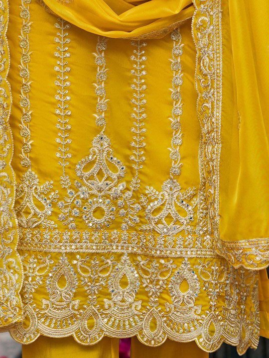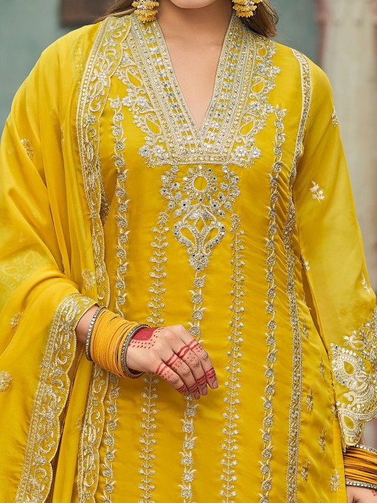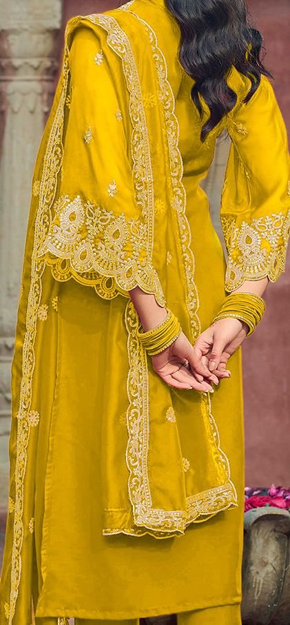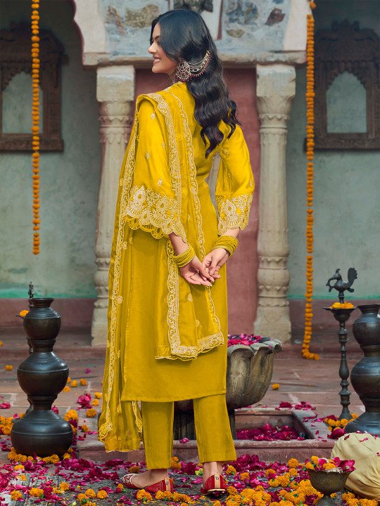 Radiant yellow and gold-toned embroidered kurta set with trousers and dupatta.