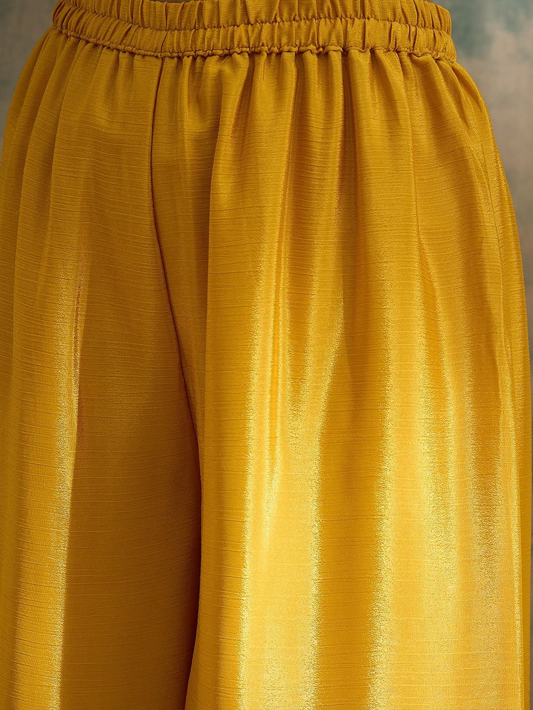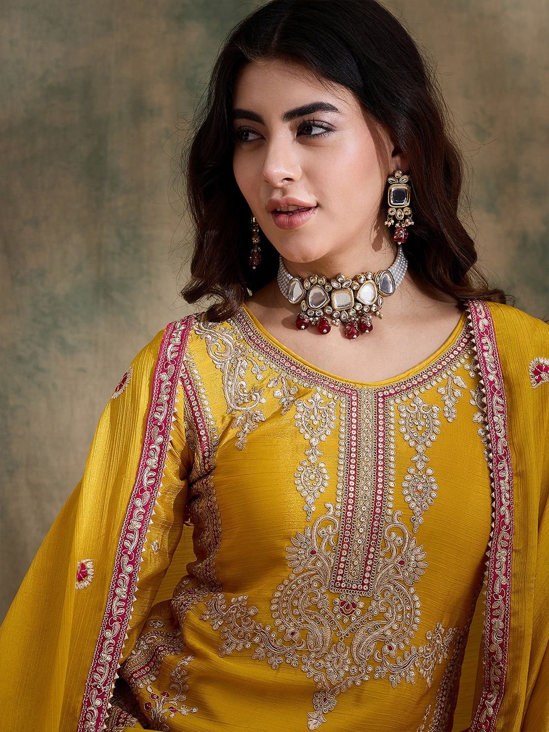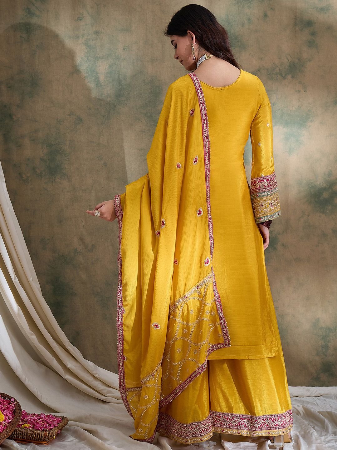 Yellow & Pink Embroidered Chinon Kurta Palazzo Set