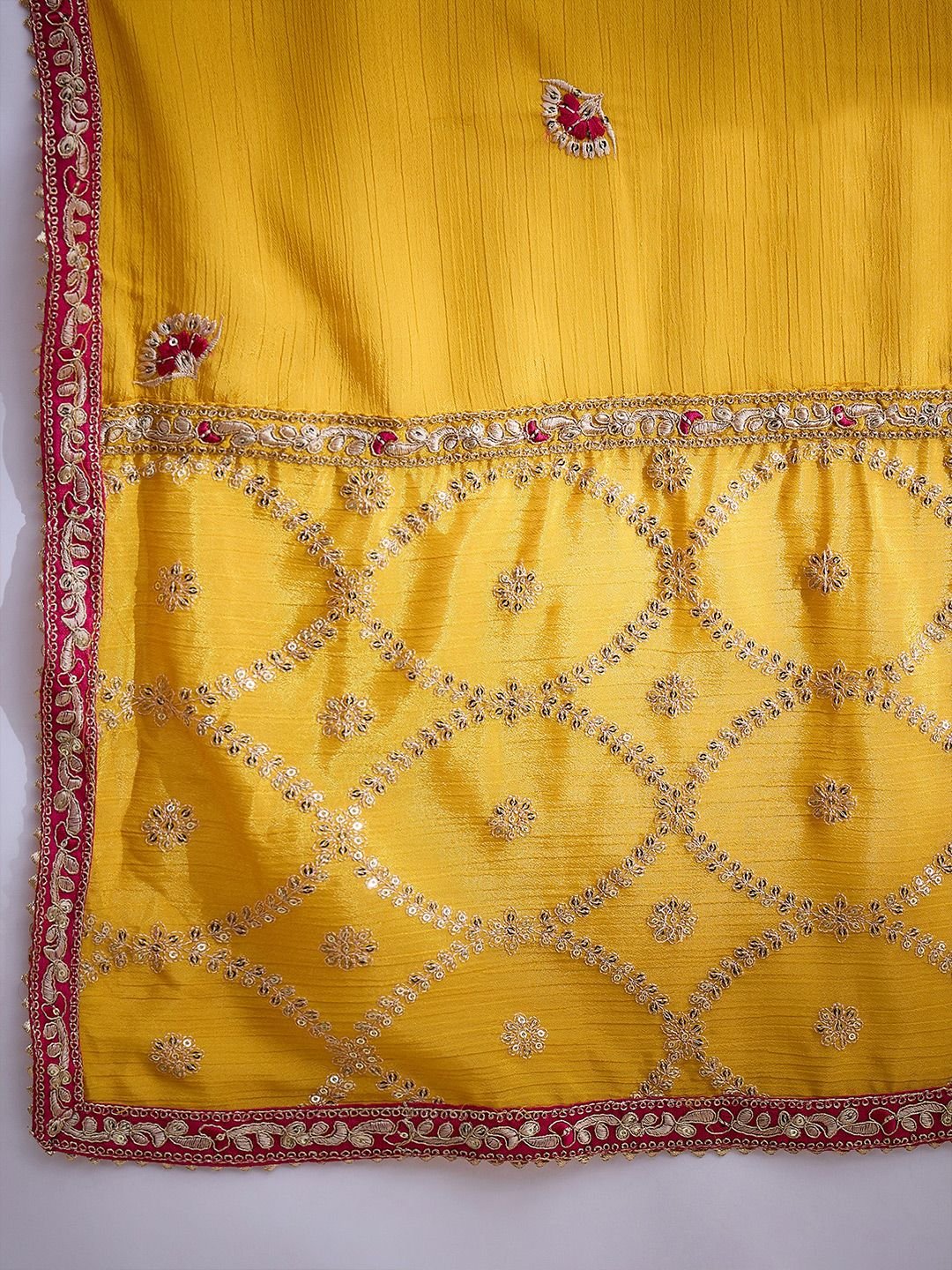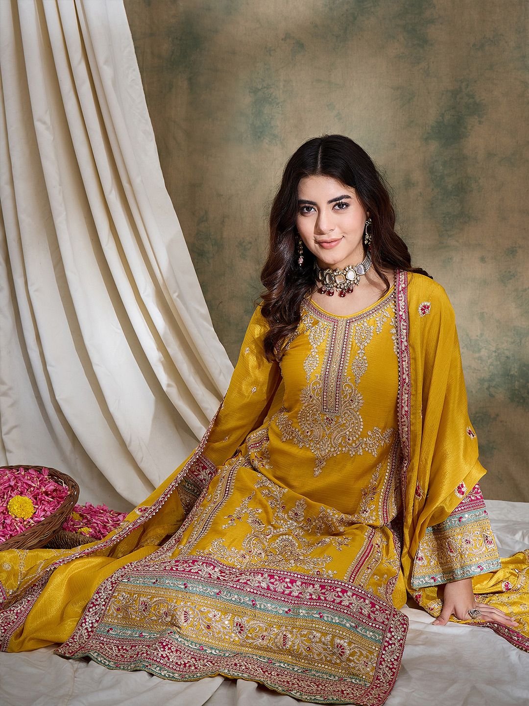 Sunshine meets blossom in this stunning Yellow & Pink Embroidered Chinon Kurta Set. Crafted from lightweight chinon, the straight calf-length kurta blooms with ethnic motif embroidery and delicate thread work detailing. The dramatic long flared sleeves add a graceful, festive movement to every step. Paired with embroidered chinon palazzos and a poly chiffon dupatta, this 3-piece set is everything you need to light up any celebration.