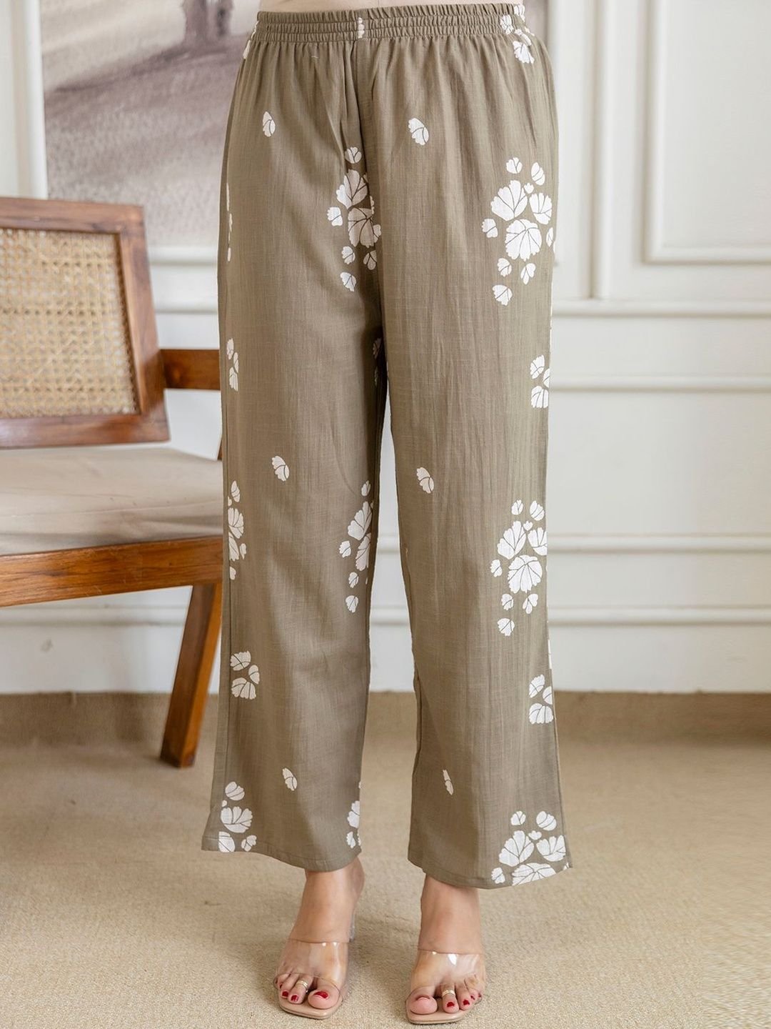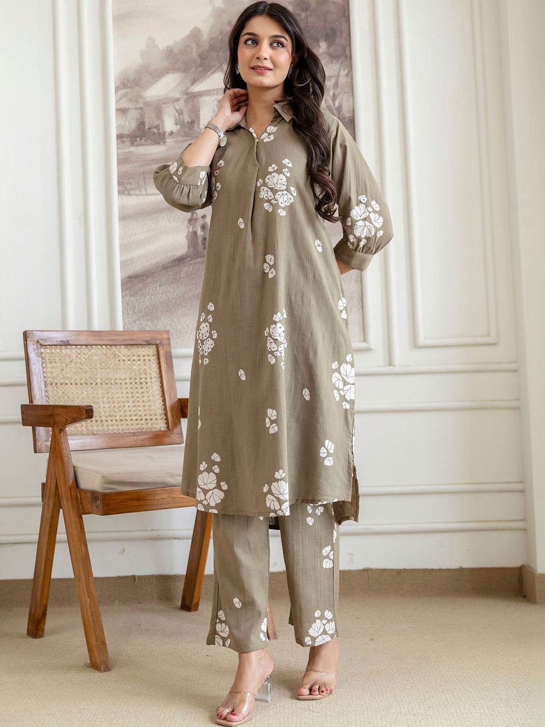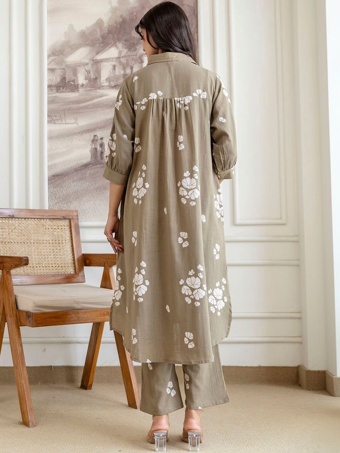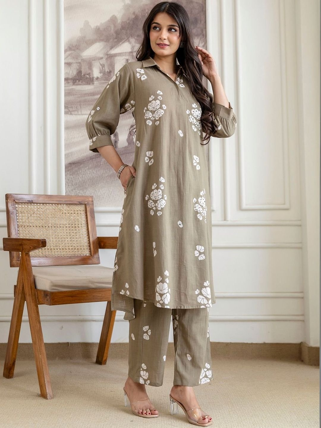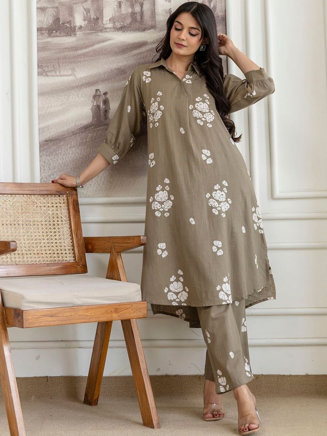 Grey is the most versatile base a printed fabric can have — it lets the floral pattern breathe without fighting a strong background colour. This pure cotton tunic takes that idea further with details that earn attention on their own: a shirt collar that gives the neckline genuine structure, snap button closure for ease and a touch of utility, and an asymmetric hem that gives the straight silhouette visual interest without adding volume. The printed straight-hem trousers with two pockets and slip-on closure complete a set that works across casual occasions, the office, and fusion gatherings without adjustment.