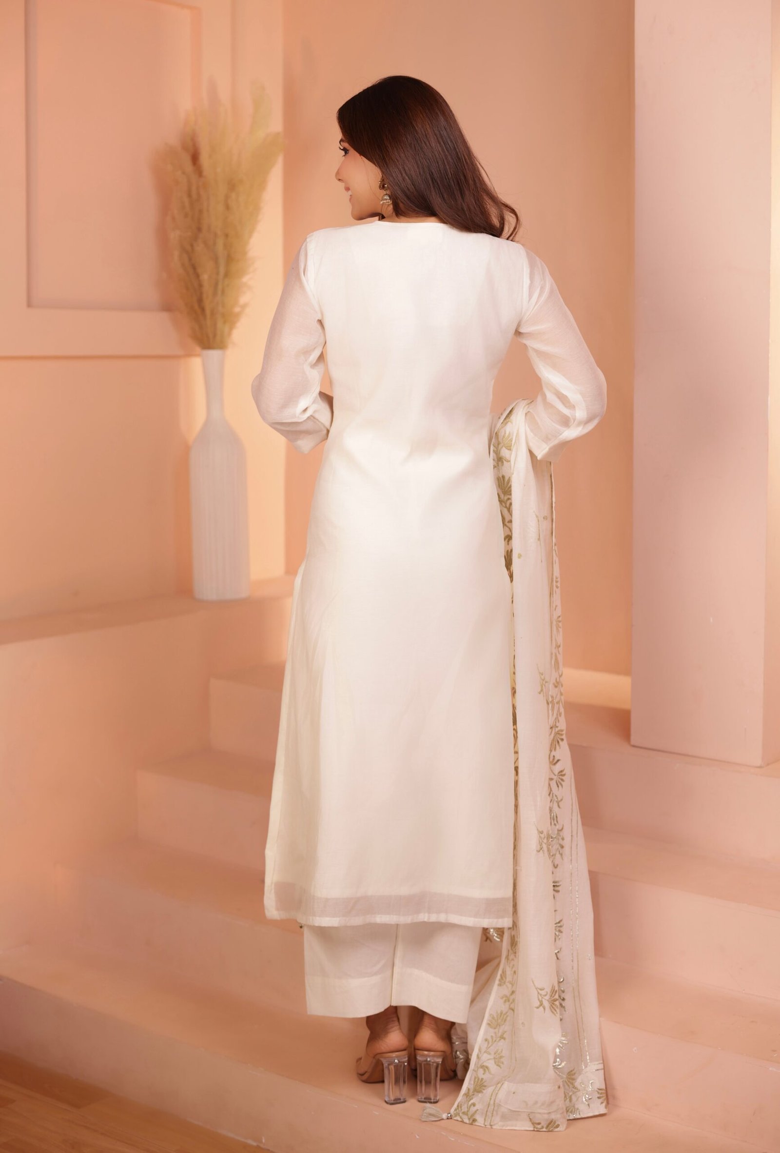 Ivory Pure Mul Chanderi Kurta Set Mul Chanderi · Metallic Thread & Floral Embroidery · Shantoon Pants · Set of 3