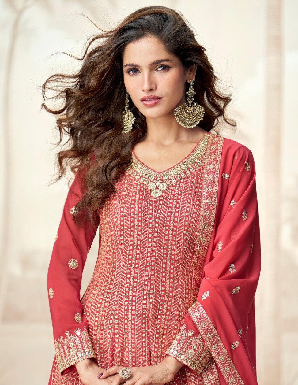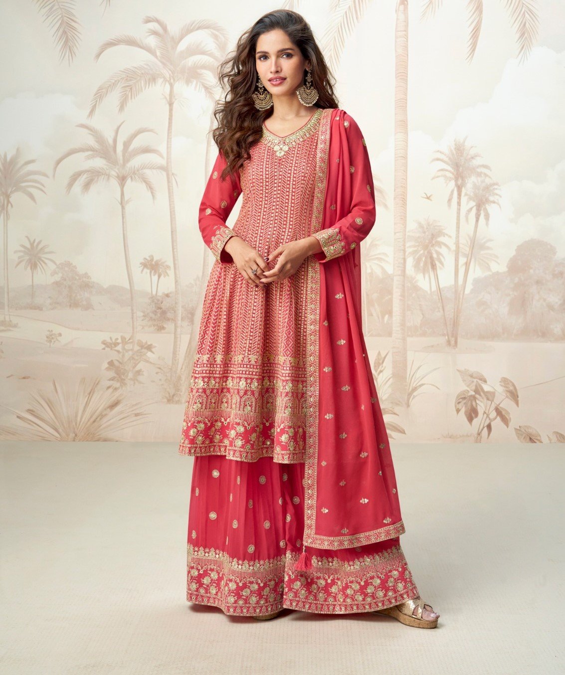 The flared kurta with layered hem, voluminous sharara, and matching embroidered dupatta create a silhouette that is graceful, festive, and effortlessly regal. Ideal for weddings, mehndi functions, Eid, sangeet, and all grand celebrations.