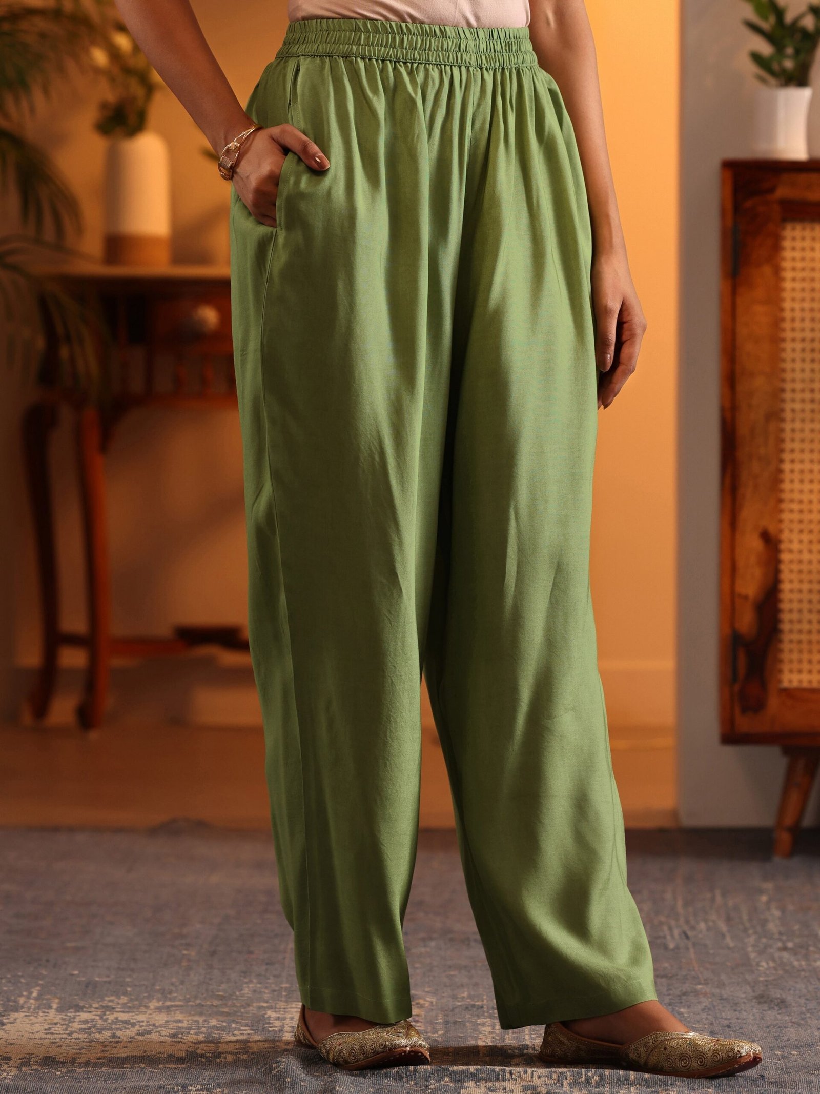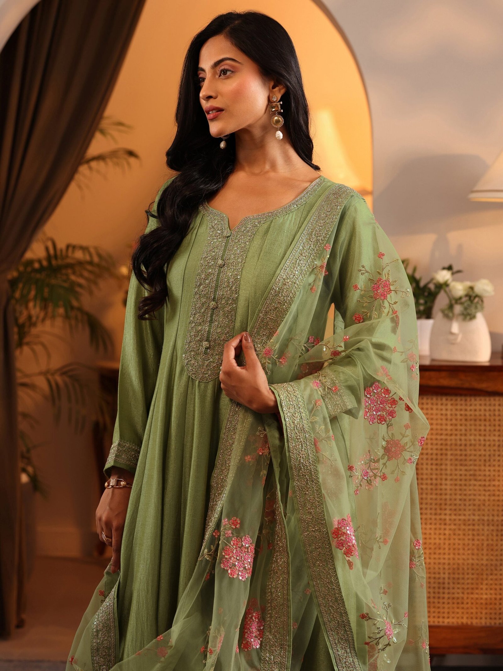 Elevate your festive wardrobe with this stunning silk blend Anarkali kurta set in rich forest green. Striking yoke embroidery and a calf-length flared hemline lend a regal, graceful presence. Paired with tailored straight trousers and a beautifully embroidered dupatta.