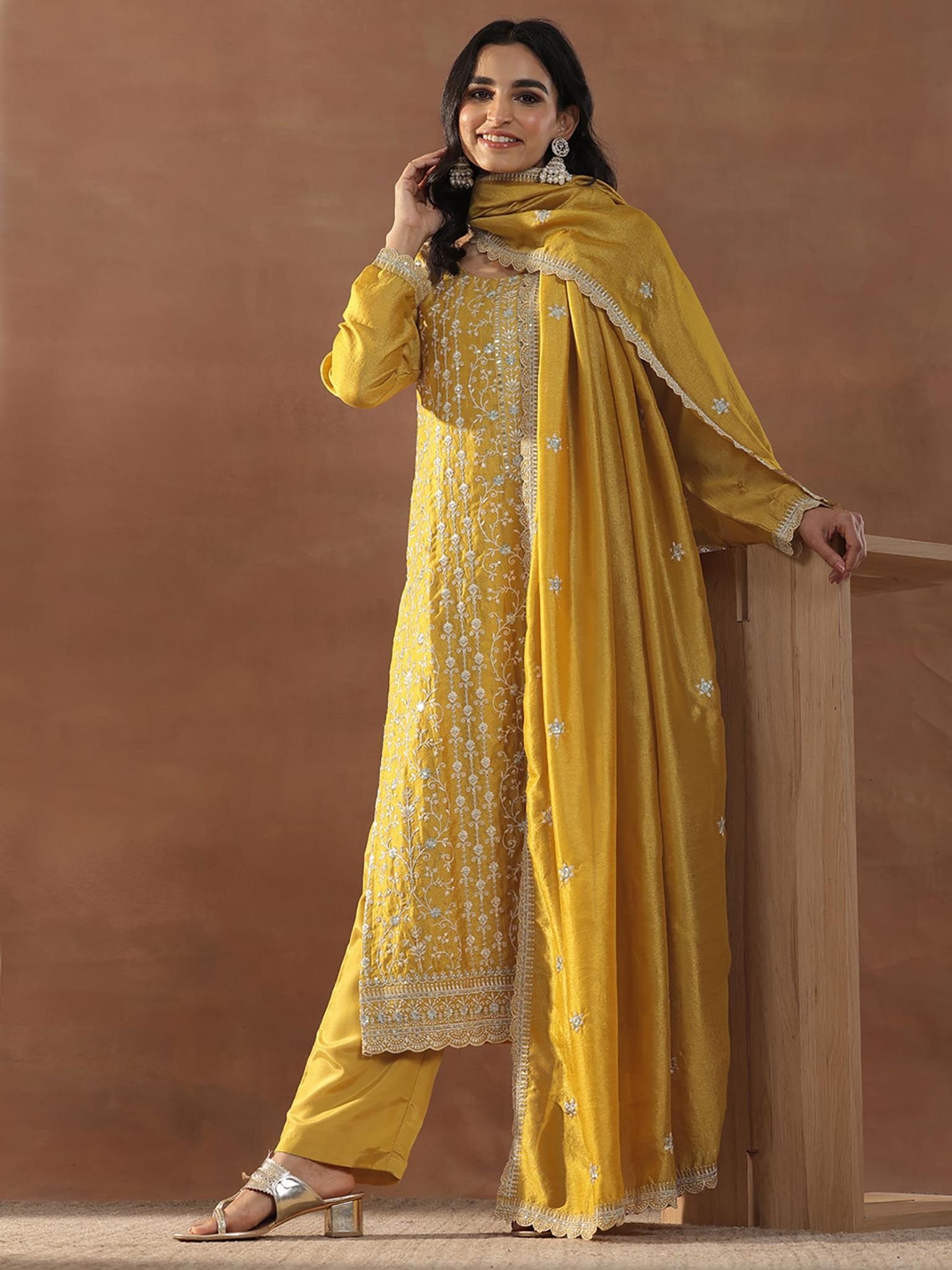 Effortlessly stylish and timelessly refined, this Mustard Floral Embroidered Straight Kurta Set from Asra Bridal Dress Studio blends classic charm with modern ease. Crafted from a luxurious silk blend fabric, this 3-piece ensemble radiates warmth and festivity through its vibrant mustard palette. The kurta showcases delicate floral embroidery with sequined embellishments that catch and scatter light beautifully at every angle. The scoop neckline and full sleeves create a sophisticated silhouette — elegant without being overdone — while a practical slit pocket adds a touch of modern functionality. Paired with a solid straight pant featuring a mid-waist partially elasticated fit and a matching dupatta, this set is the epitome of understated elegance — perfect for festive celebrations, weddings, Eid, and every special occasion.