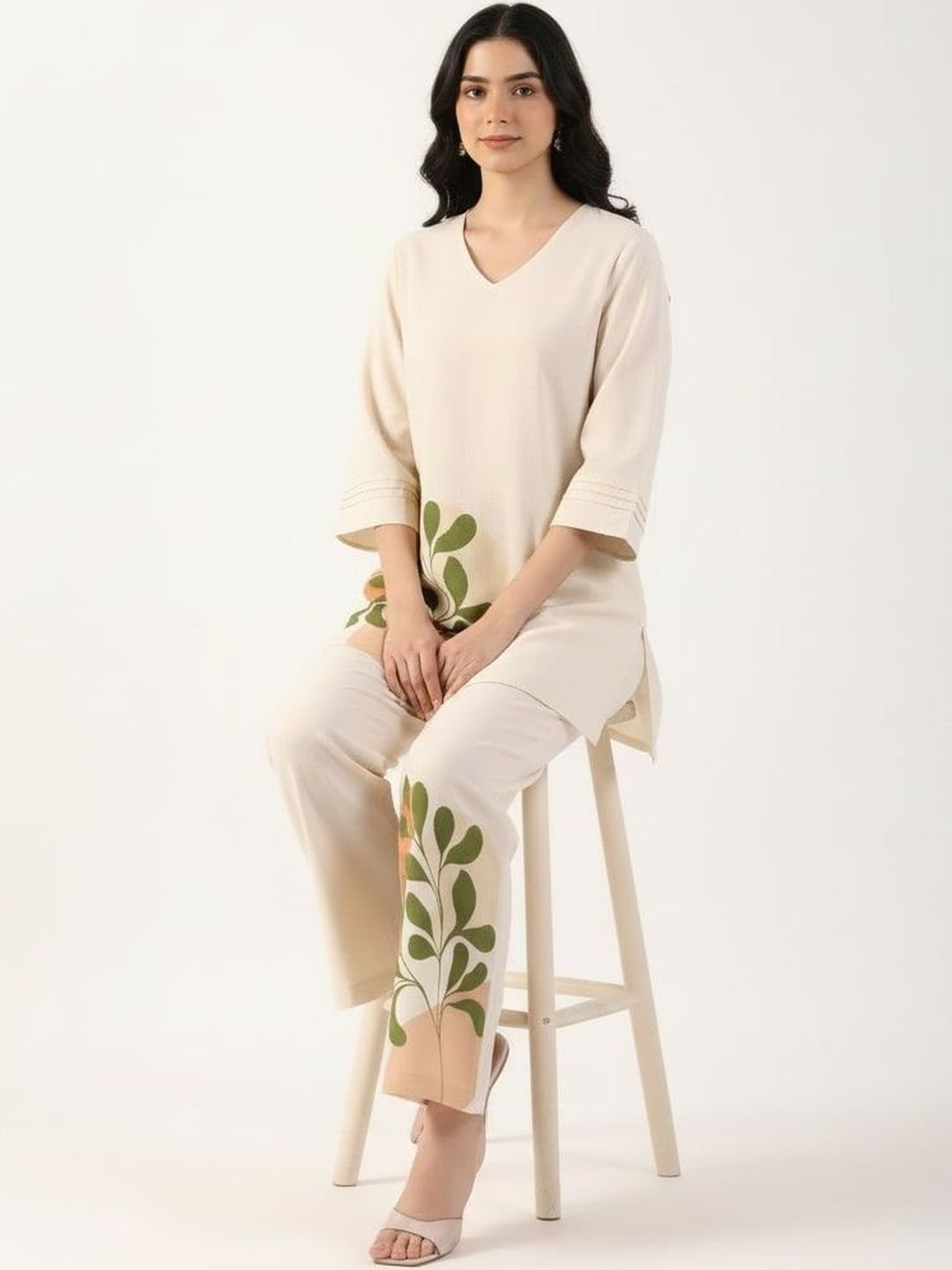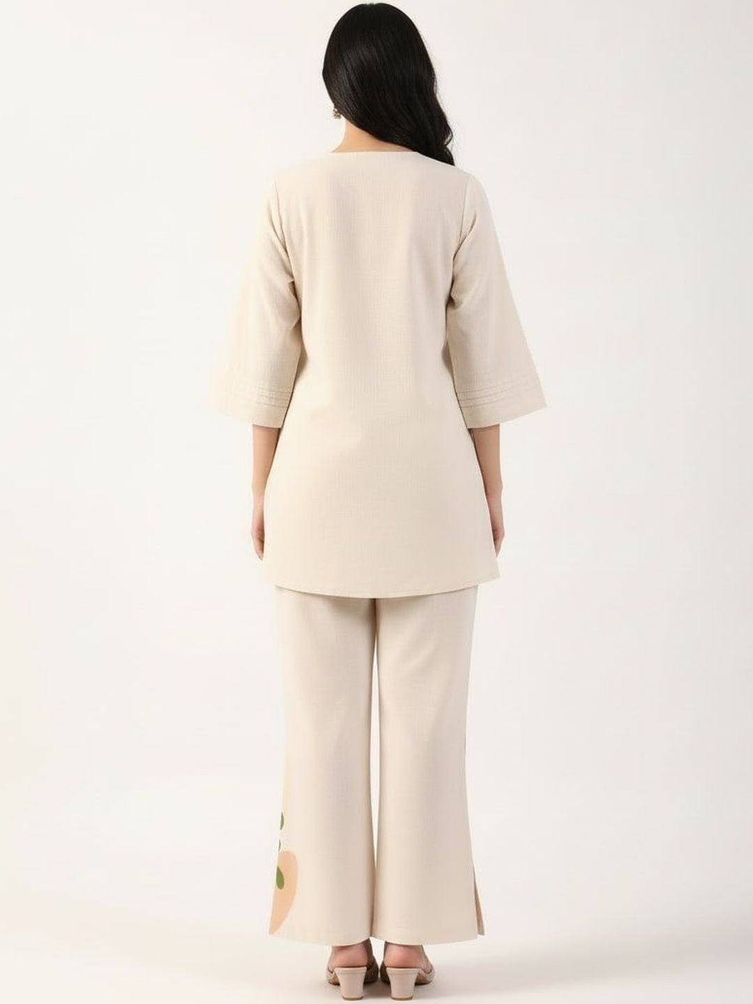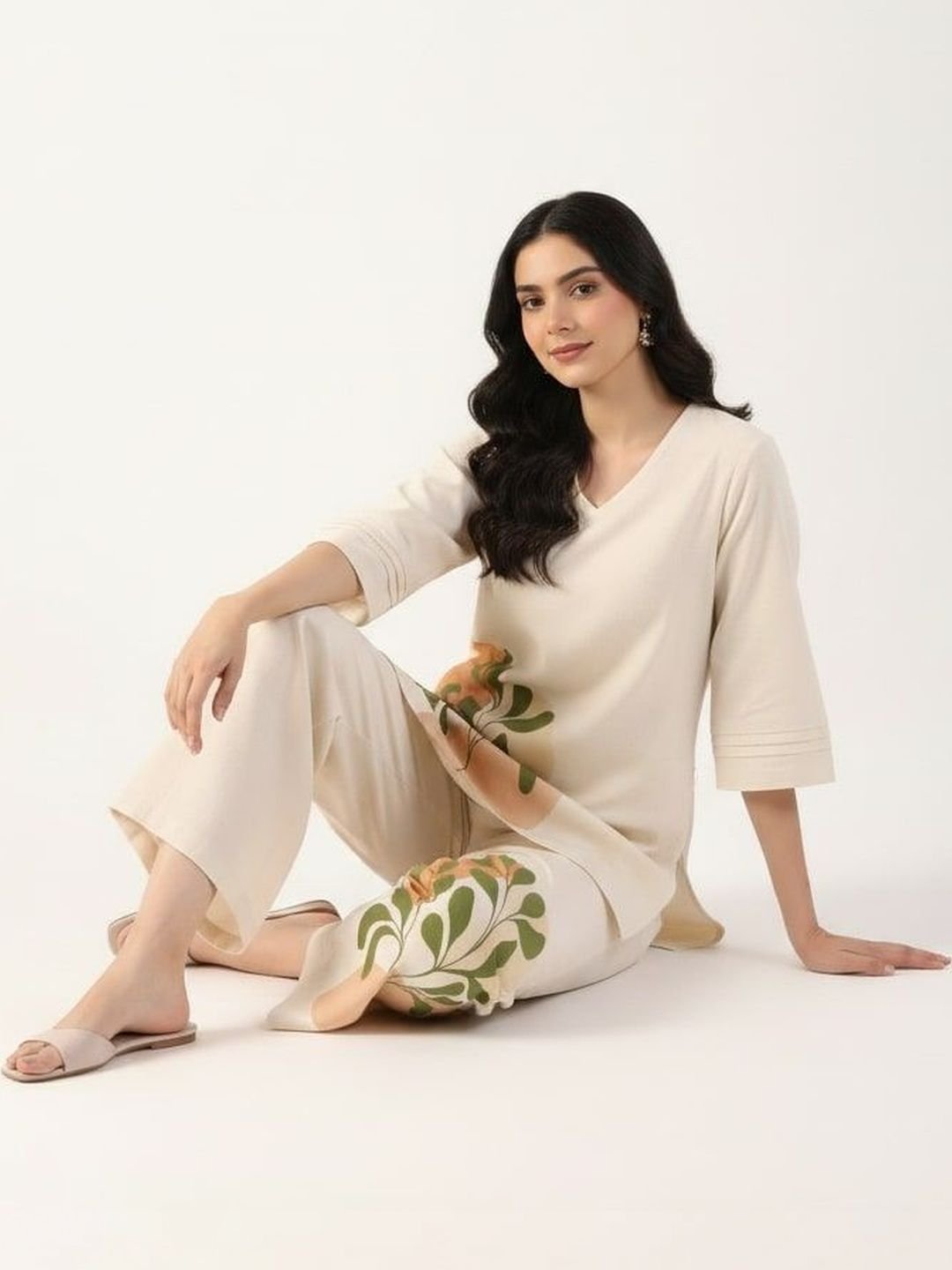 Off white and a floral print is one of those combinations that never needs justification — it works across seasons, occasions, and moods. This 100% pure cotton co-ord builds on that with the specifics that matter: a V-neck straight hem top that doesn’t over-promise its silhouette, three-quarter sleeves that balance the coverage, and a printed palazzo with elasticated waist and 2 real pockets that turns this from a style set into an everyday set. Hand wash to preserve the print quality through regular wear.