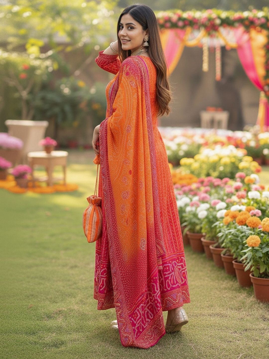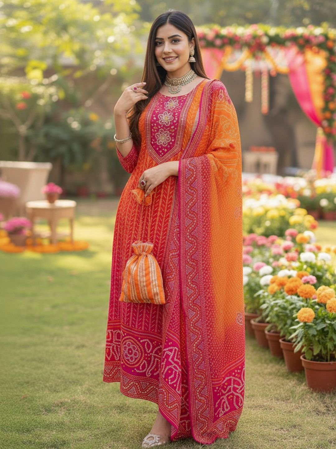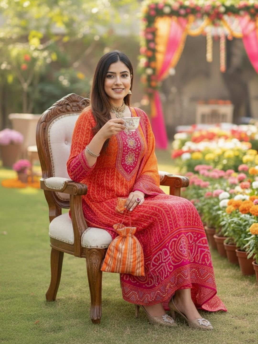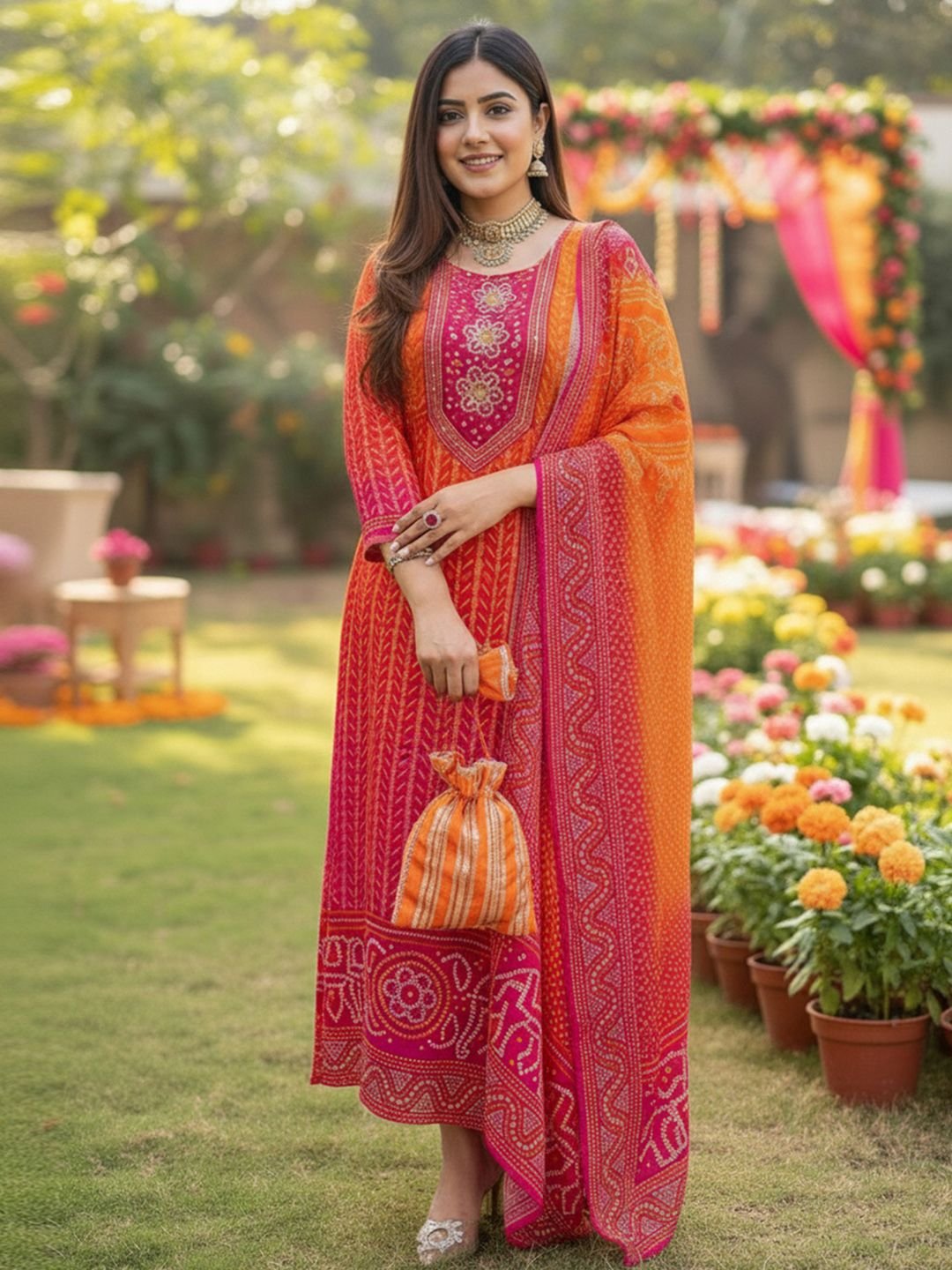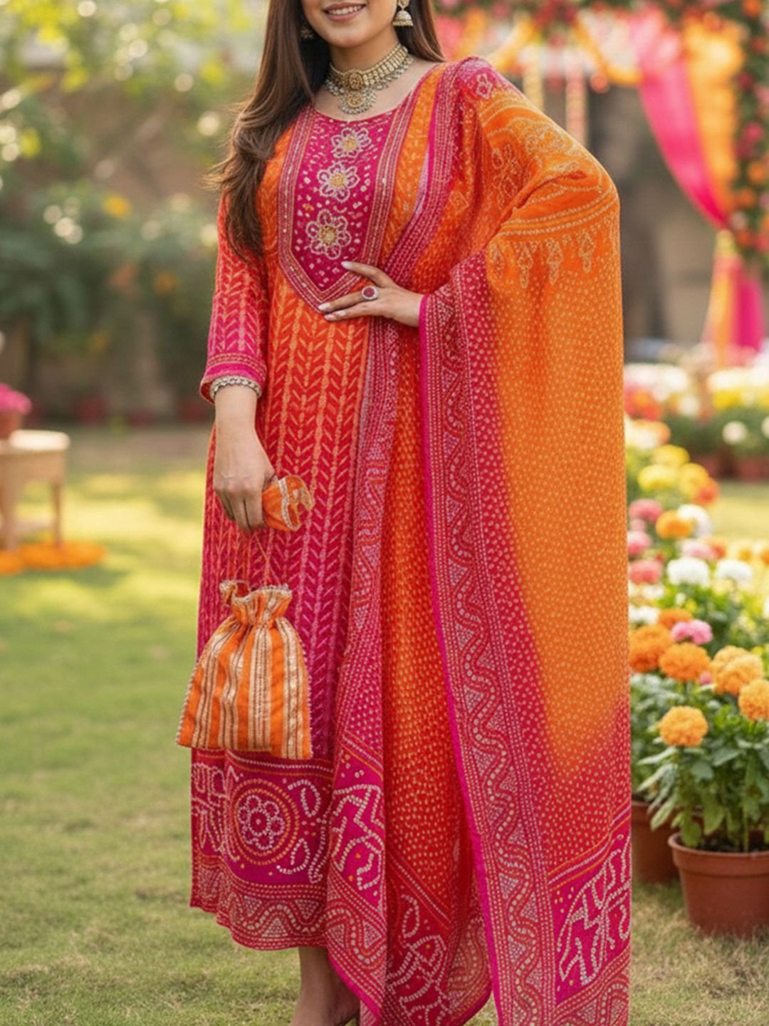 The Leheriya dye creates a fabric that already has visual interest before any embellishment — the diagonal wave pattern is the hero, giving the kurta a handcrafted quality. The large-coverage thread work embroidery adds a festive layer on top, making it appropriate for occasions while keeping the dye pattern visible and prominent. The straight calf-length silhouette with round neck and three-quarter sleeves keeps the construction clean so the colour and dye do the work. The solid trouser and printed dupatta complete the three-piece without competing with the kurta.