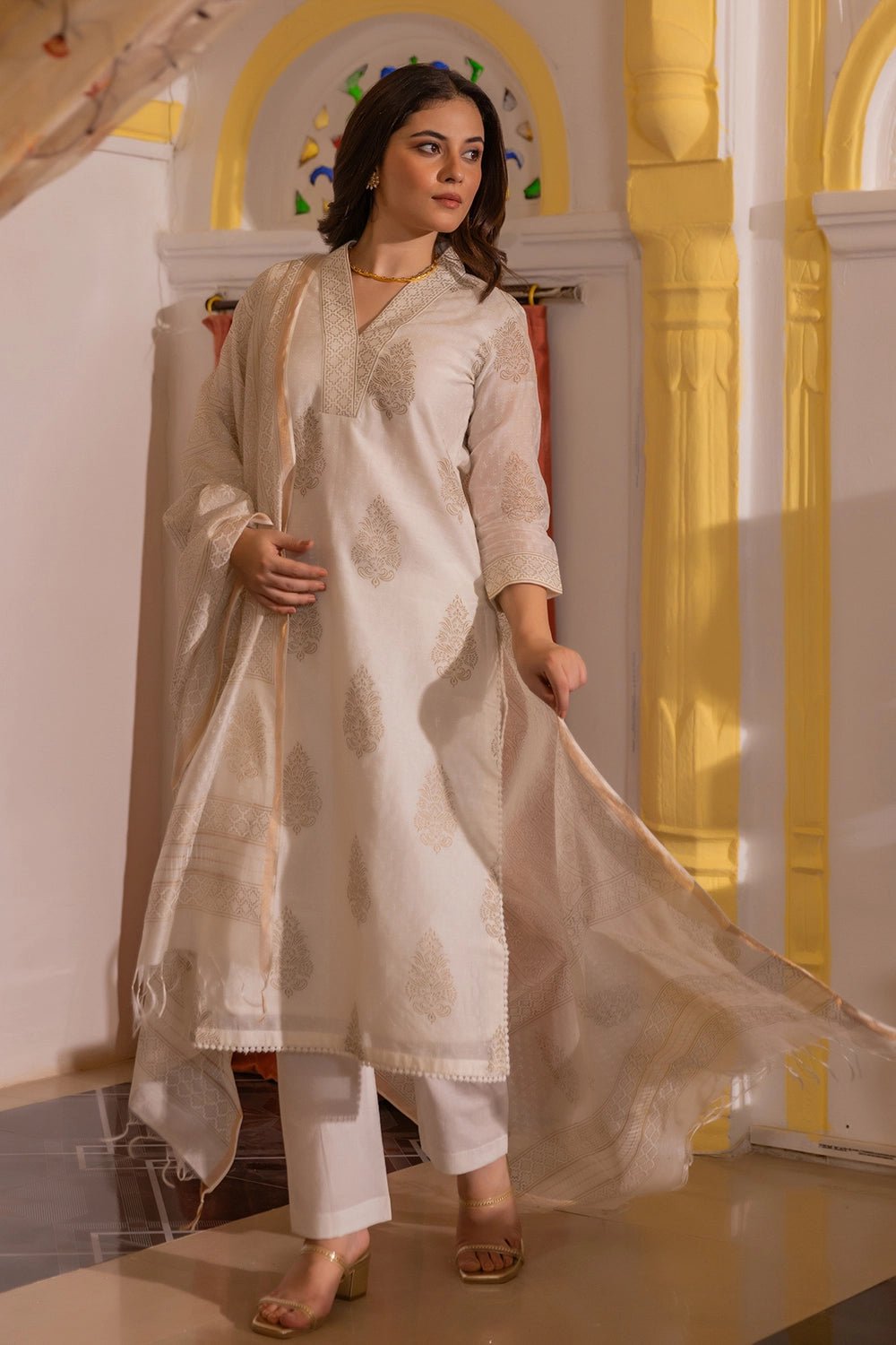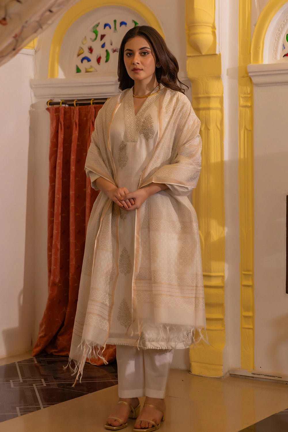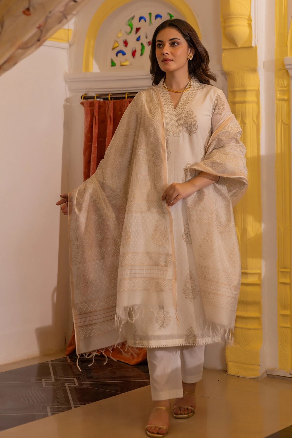 Crafted from pure Chanderi fabric, this ensemble is celebrated for its delicate texture, soft sheen, and breathability — making it a perfect choice for both warm and cool seasons. The intricate gold print lends a regal, elegant touch, while the A-line kurta silhouette keeps the look timeless and graceful. Completed with a matching Chanderi dupatta featuring complementary gold block prints and fringed edges, this set is a beautiful fusion of heritage and contemporary style.