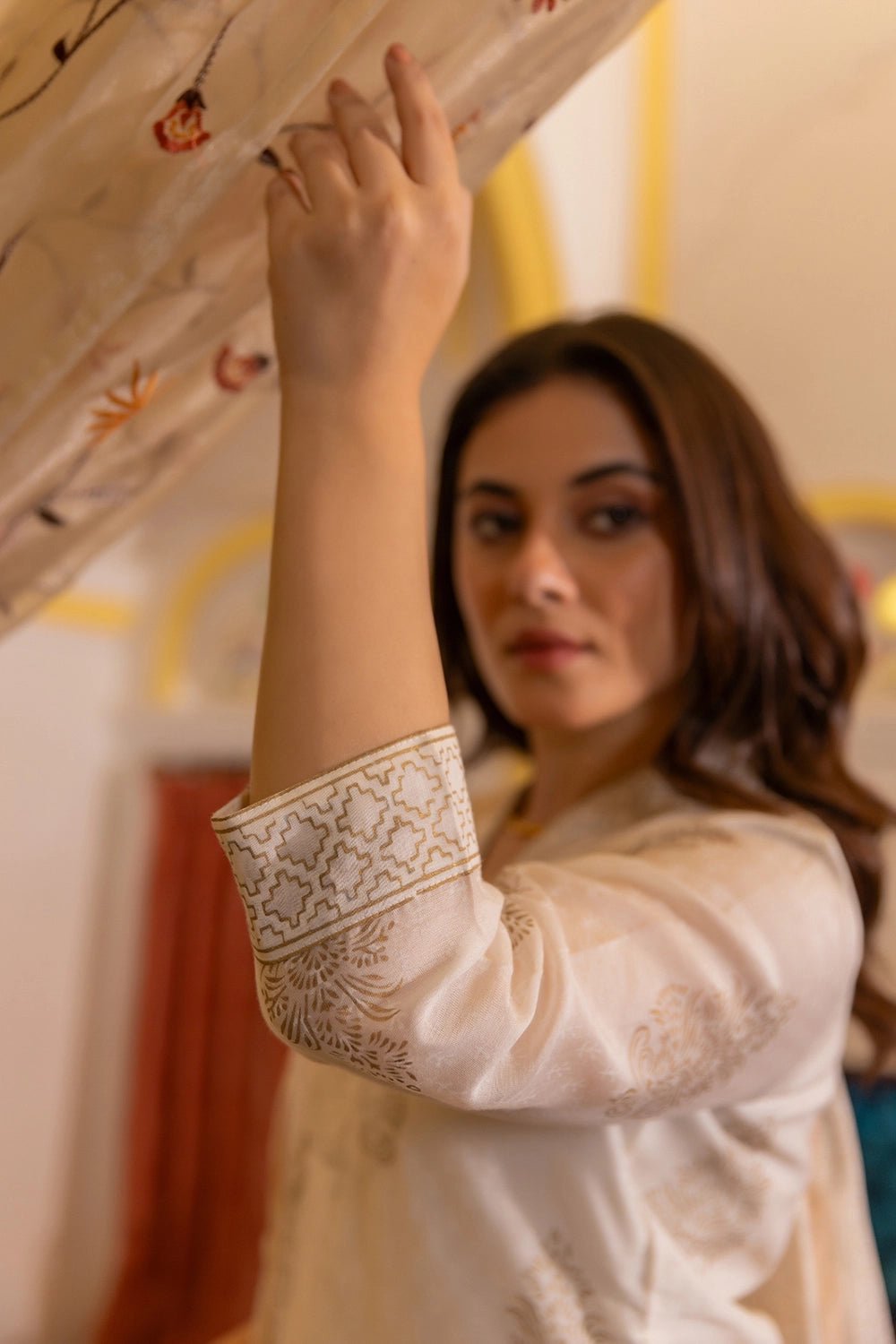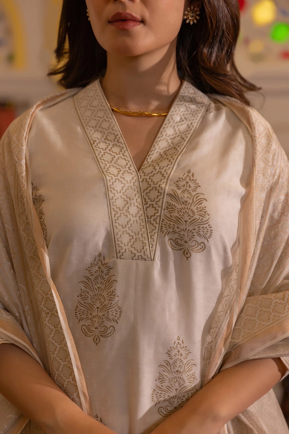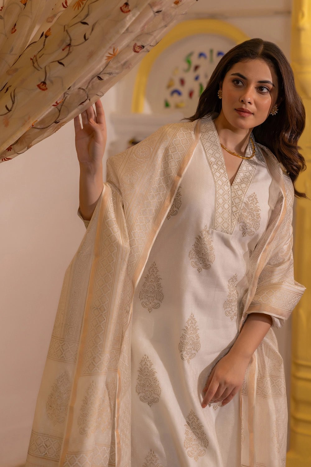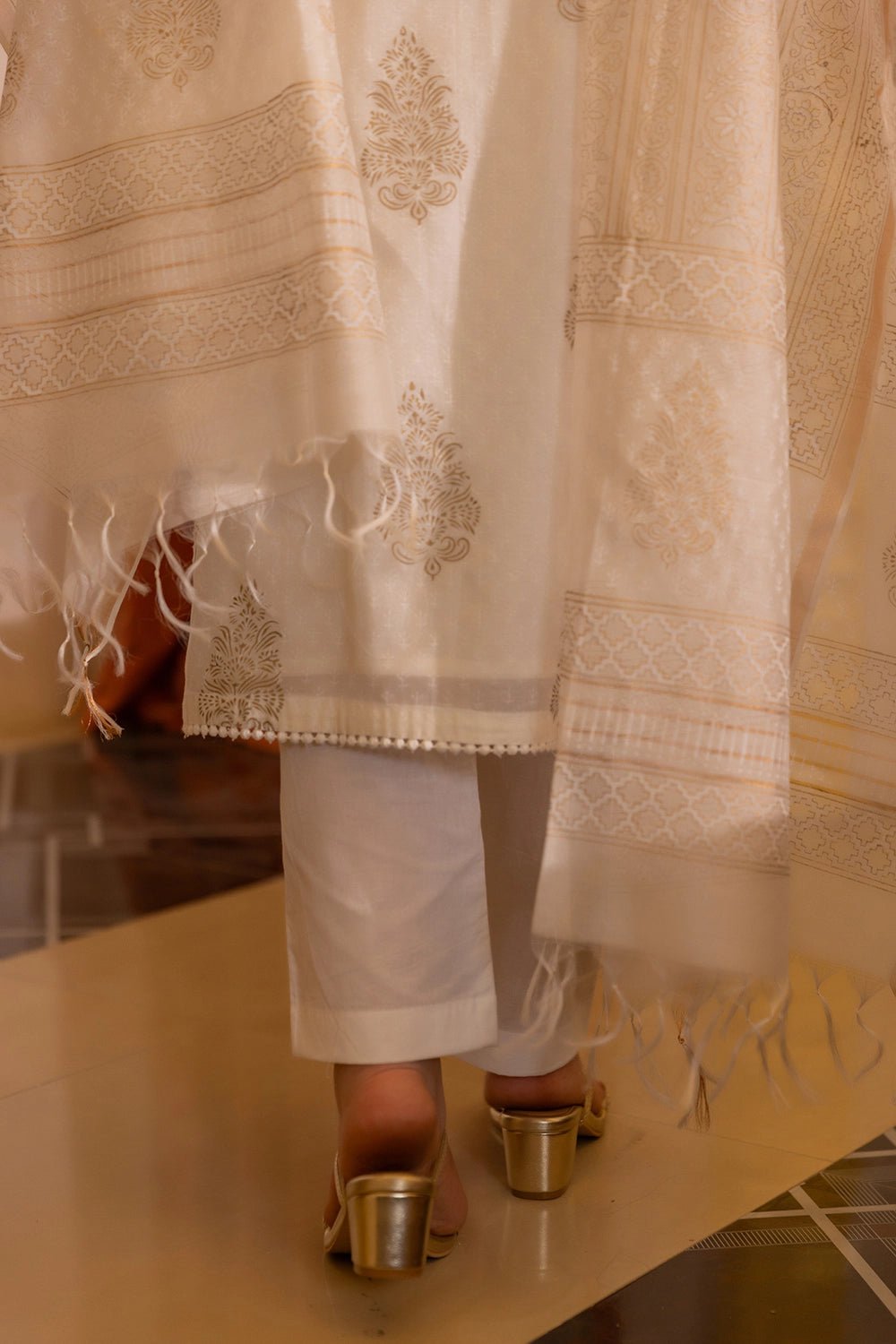 Crafted from pure Chanderi fabric, this ensemble is celebrated for its delicate texture, soft sheen, and breathability — making it a perfect choice for both warm and cool seasons. The intricate gold print lends a regal, elegant touch, while the A-line kurta silhouette keeps the look timeless and graceful. Completed with a matching Chanderi dupatta featuring complementary gold block prints and fringed edges, this set is a beautiful fusion of heritage and contemporary style.