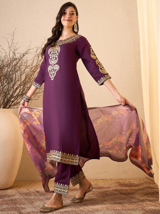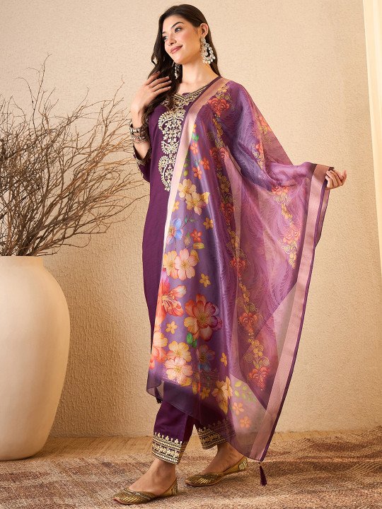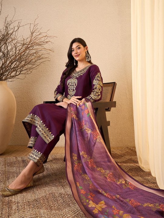 Purple Floral Embroidered Silk Blend Kurta With Trousers & Organza Dupatta | V-Neck Thread Work 3-Piece Set