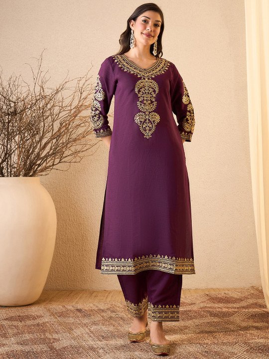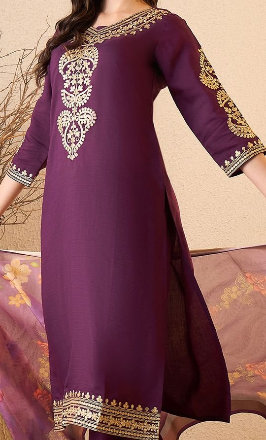 Wear royalty with ease in this exquisite purple floral embroidered silk blend kurta set. The calf-length straight kurta is crafted in premium silk blend fabric — delivering a beautiful natural sheen, smooth drape, and a polished finish that photographs beautifully. Intricate floral embroidery with delicate thread work is placed strategically at the yoke and border, creating a focused, eye-catching detail that elevates the entire silhouette without overwhelming the rich purple palette.