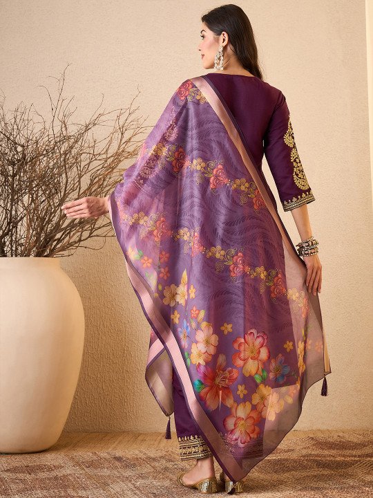 Purple Embroidered Kurta Silk Blend Floral Embroidery Thread Work V-Neck KurtaYoke Embroidery Organza Dupatta1 Pocket Calf Length3-Piece Set Party Wear Festive Wear