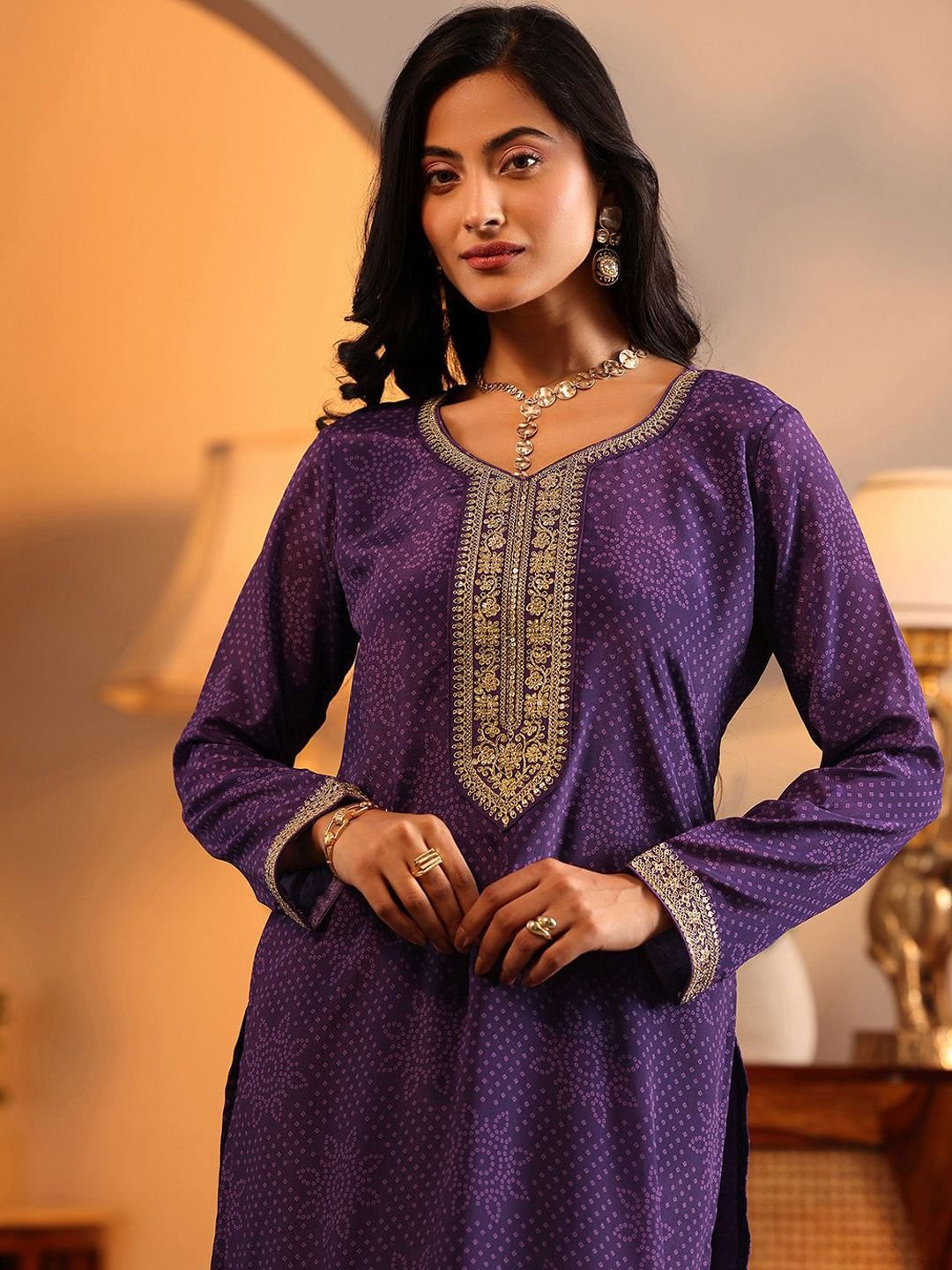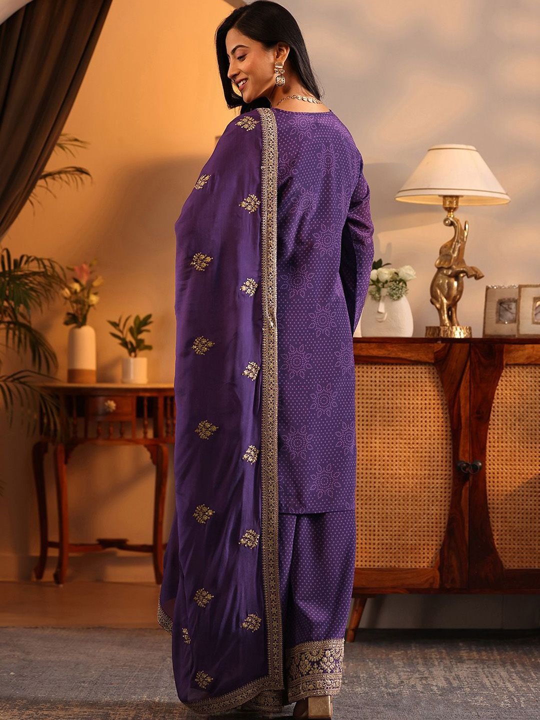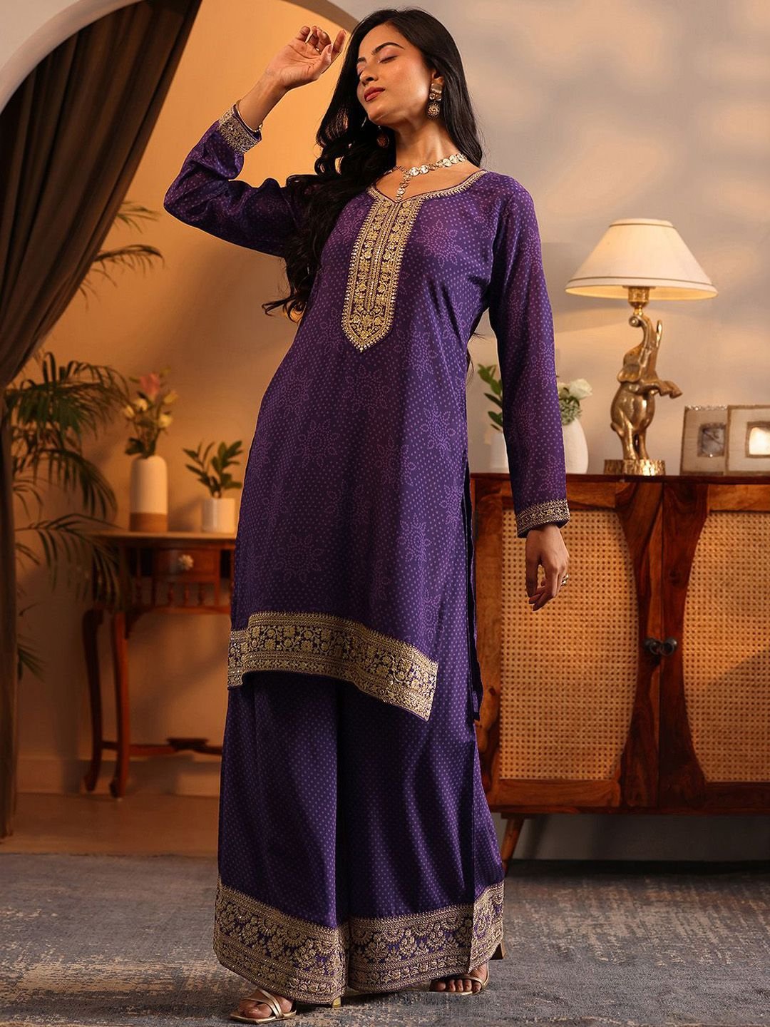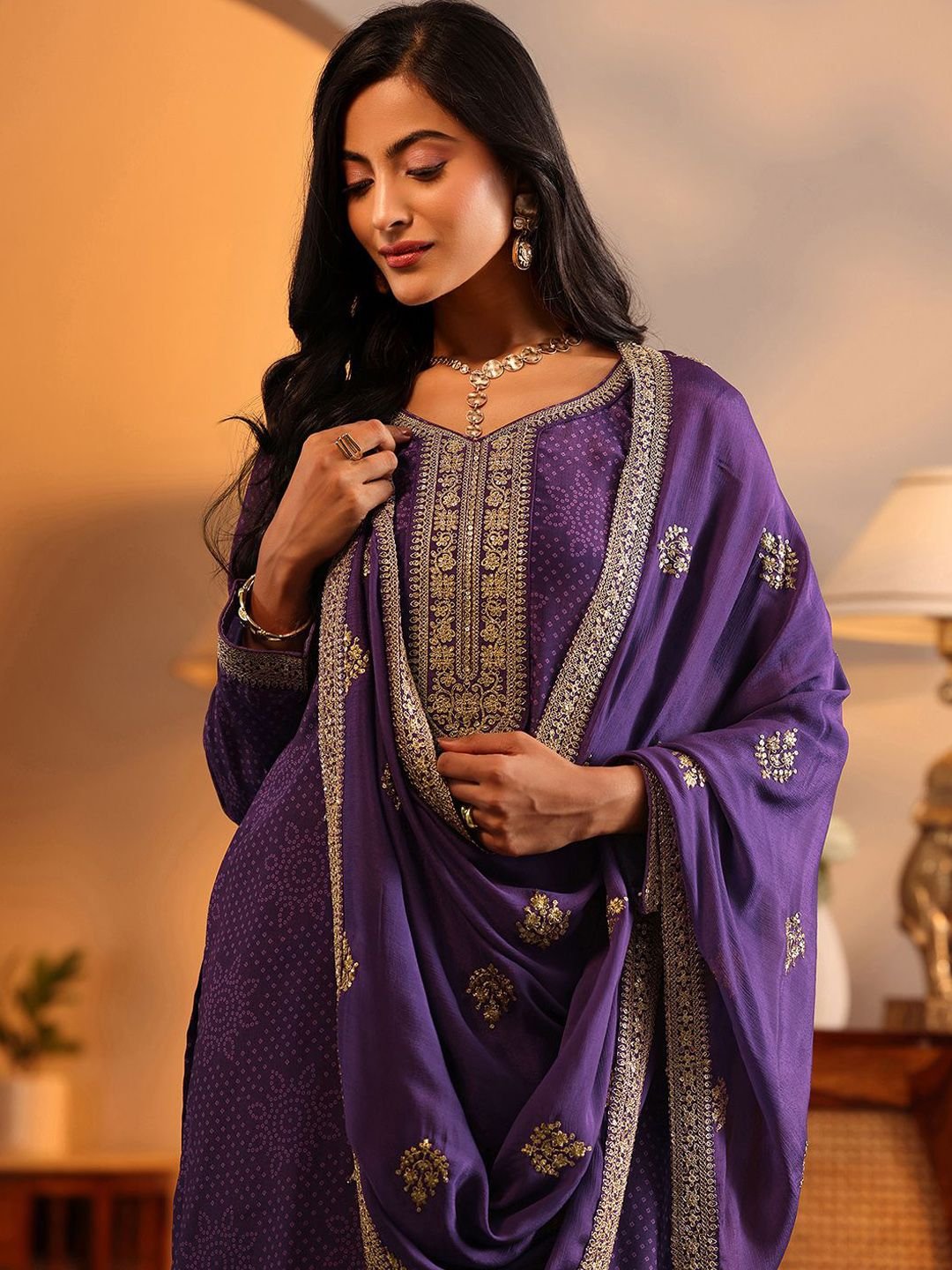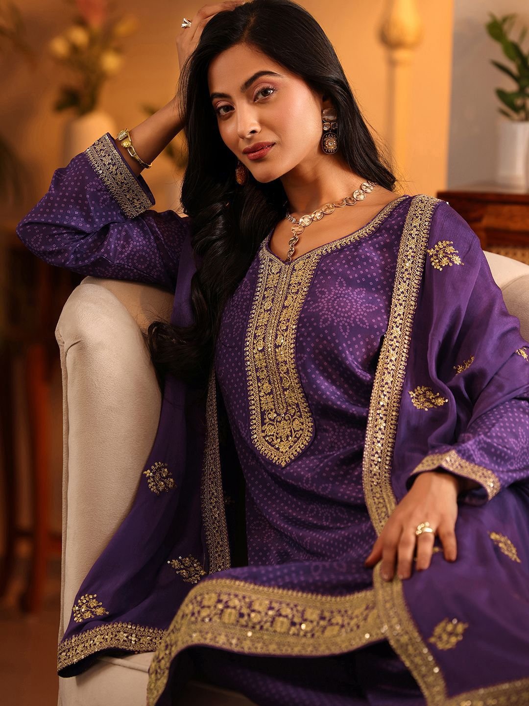 Regal and radiant — this Purple & Gold Bandhani Embroidered Kurta Set is a celebration of traditional artistry on modern chinon fabric. The intricate bandhani embroidery in gold tones catches the light beautifully, while the V-neckline and long sleeves lend timeless elegance. The calf-length straight silhouette with 2 pockets pairs effortlessly with printed chinon palazzos and a silk blend printed dupatta with taping border.