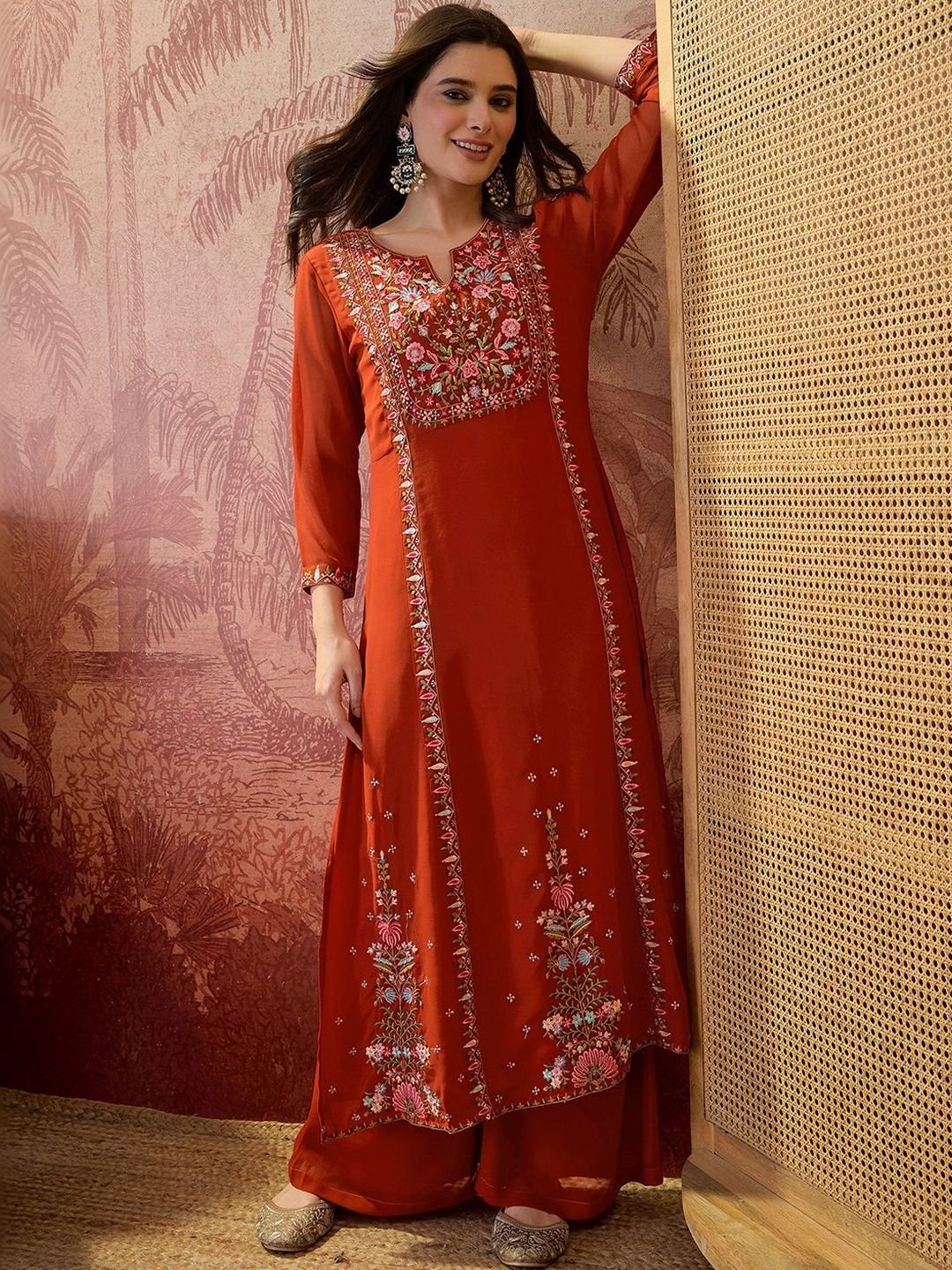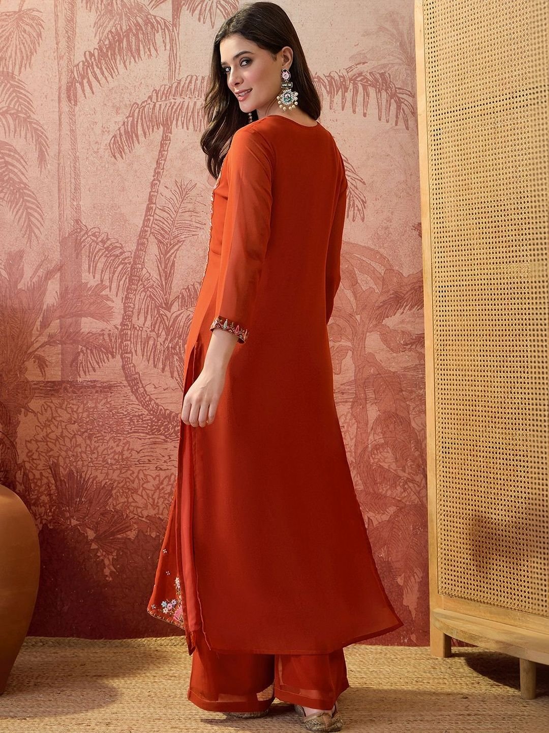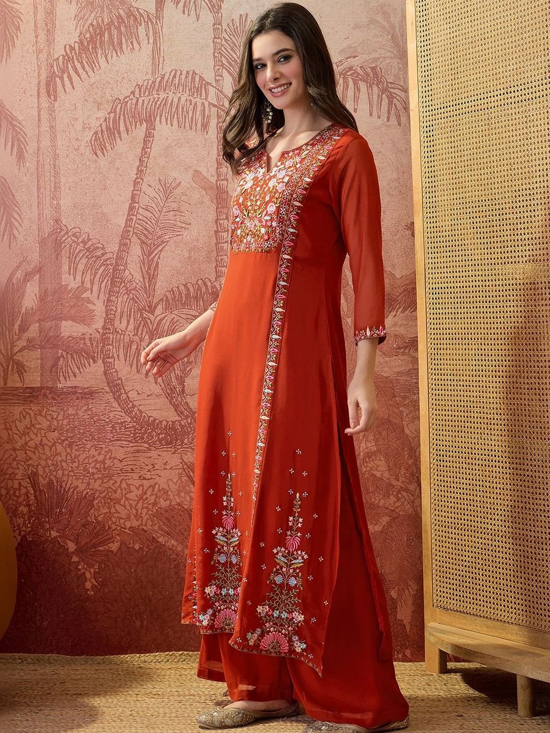 Red embroidered georgette is a festive classic for good reason — the fabric’s natural sheen and light weight give red a luminous quality that heavier fabrics can’t replicate. The pleated A-line kurta opens from the embroidered and sequined yoke through a flared calf-length hem with side slits that allow unrestricted movement without sacrificing coverage. The solid red georgette palazzo with partial elastic waist keeps the lower half clean so the kurta’s embellishment remains the focal point.