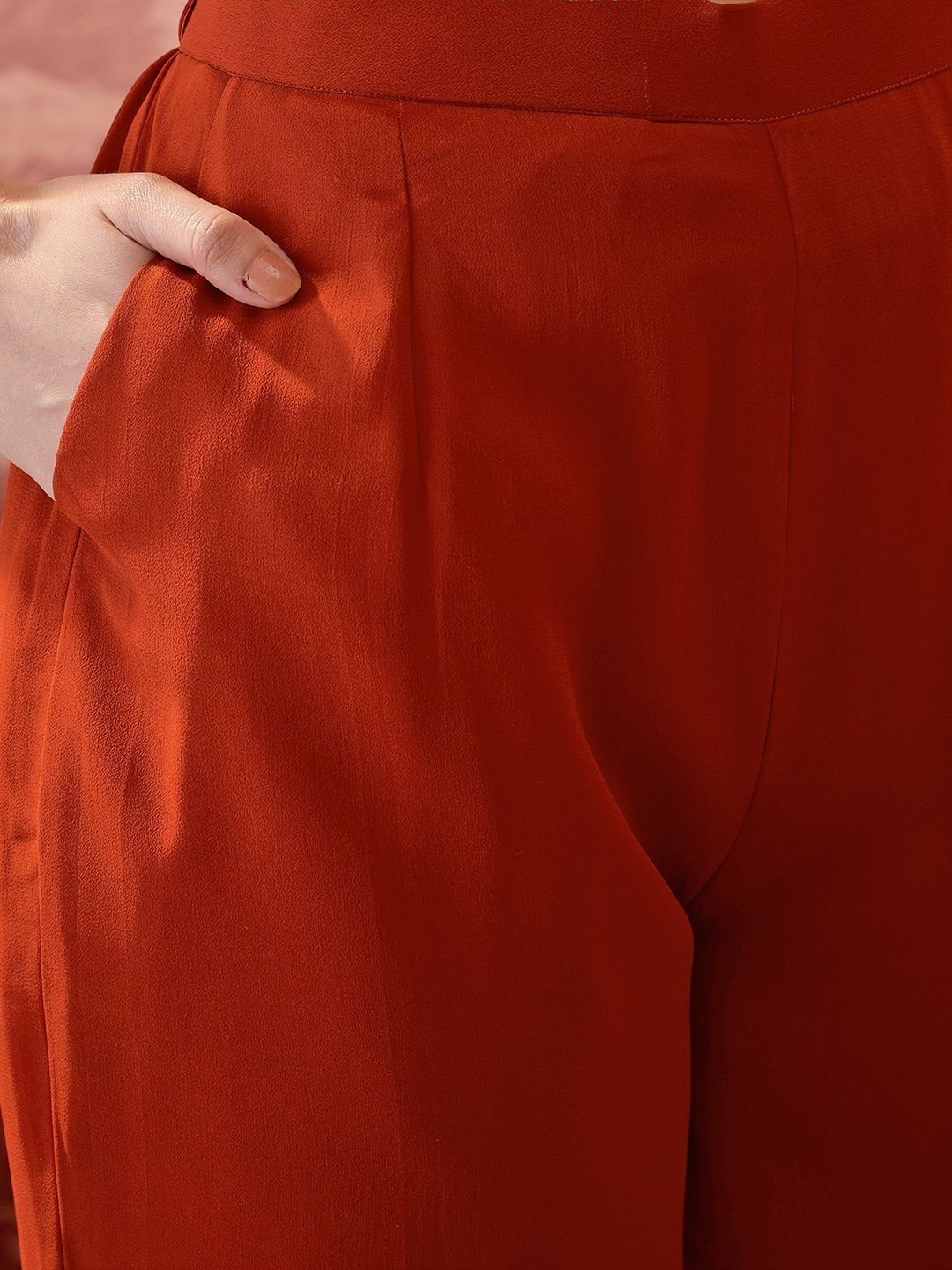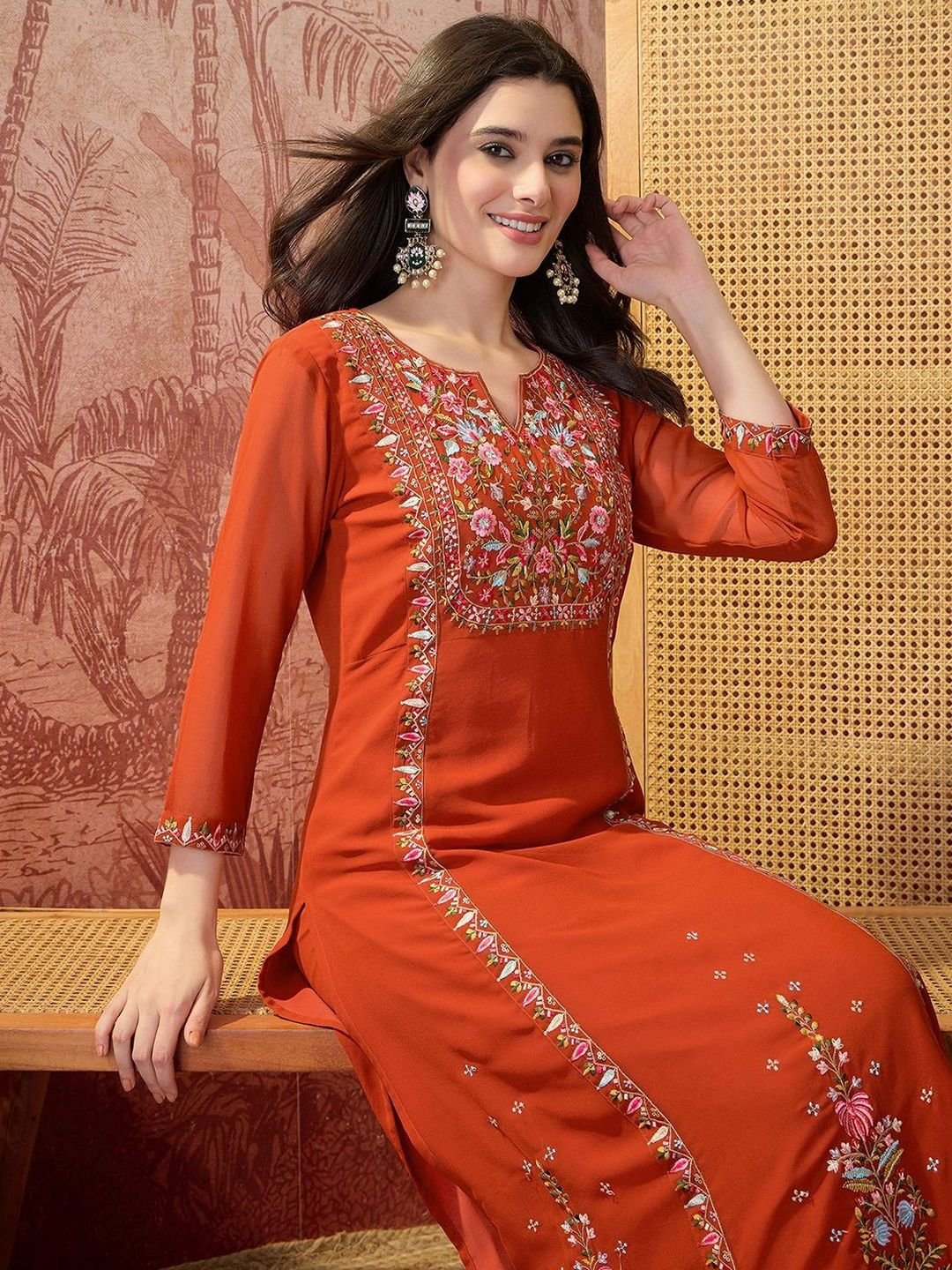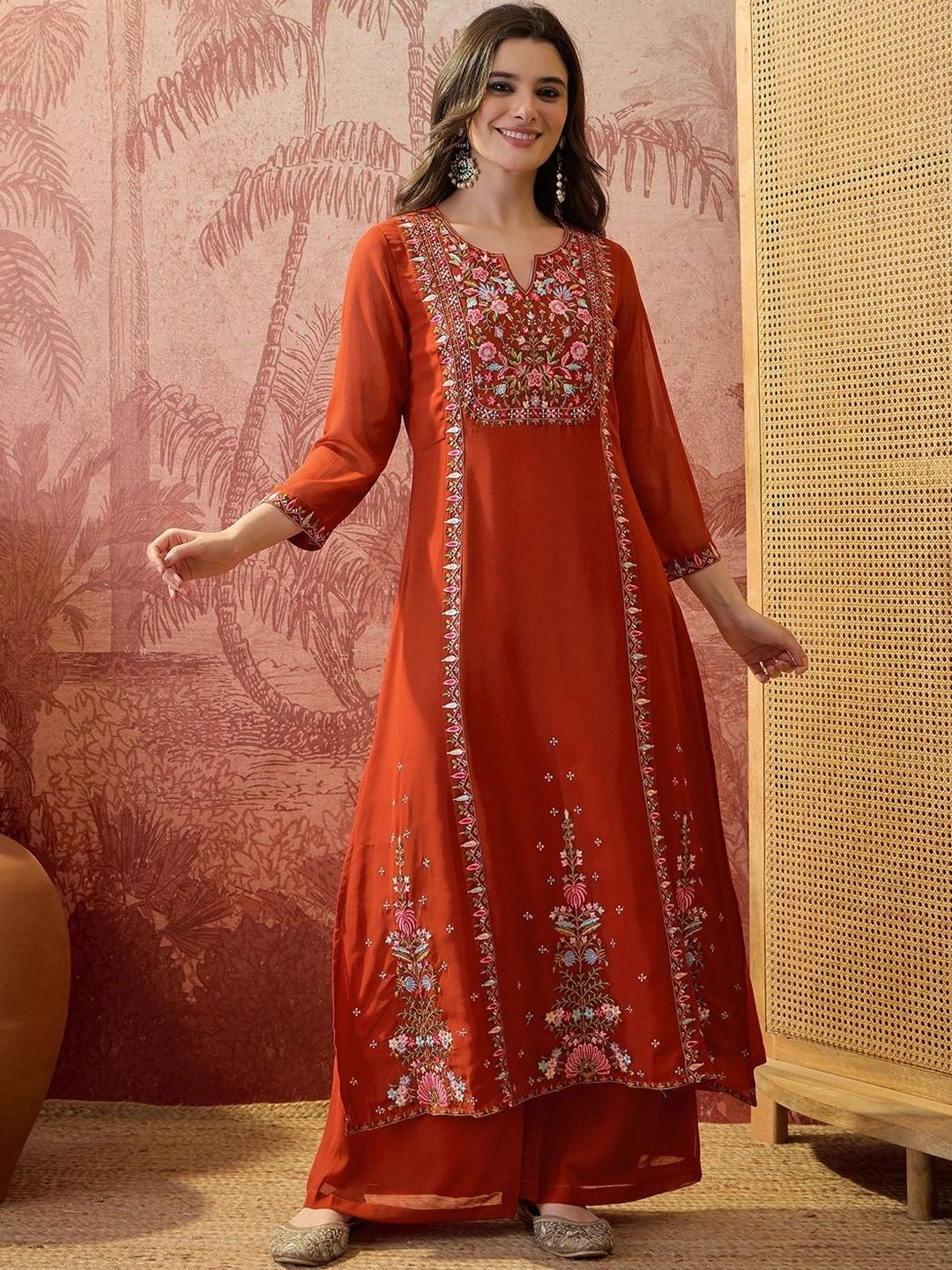 Red embroidered georgette is a festive classic for good reason — the fabric’s natural sheen and light weight give red a luminous quality that heavier fabrics can’t replicate. The pleated A-line kurta opens from the embroidered and sequined yoke through a flared calf-length hem with side slits that allow unrestricted movement without sacrificing coverage. The solid red georgette palazzo with partial elastic waist keeps the lower half clean so the kurta’s embellishment remains the focal point.