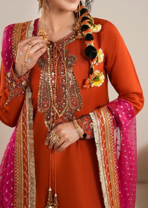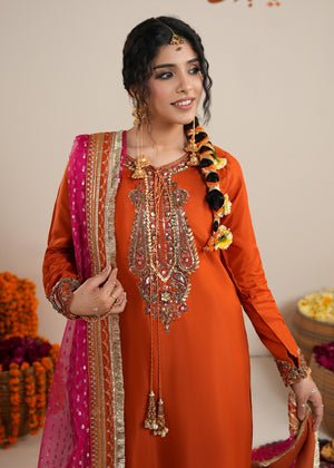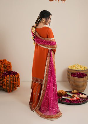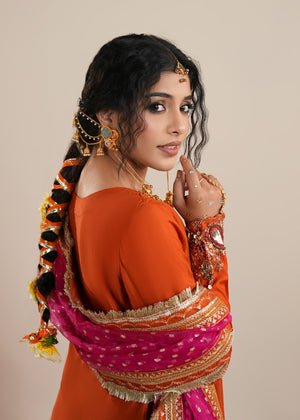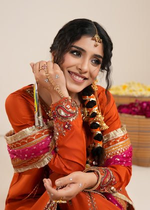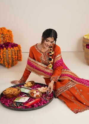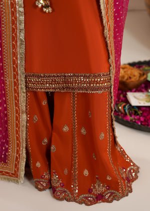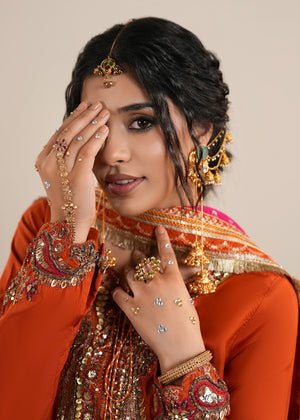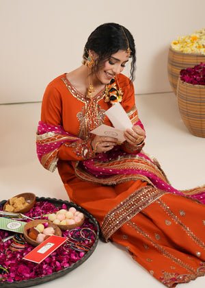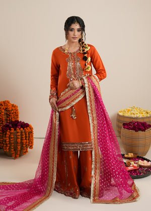 Presenting Zarqun — a rust orange raw silk sharara set that commands every room it enters. The rust orange palette is one of the most potent and resonant colours in Pakistani bridal fashion — warm, intense and deeply celebratory. The centrepiece of this ensemble is the medium-length raw silk shirt adorned with heavy embroidery and embellishment — a richly worked surface of threads, stones, and sequins that creates a shimmering, layered depth unique to artisanal Pakistani couture. This pairs with a wide-leg raw silk sharara — the silhouette of Pakistani bridal tradition, dramatic and graceful in equal measure. The look is completed by a bindi organza dupatta, whose sheer, spot-worked fabric adds lightness and contrast to the heavy splendour of the shirt and sharara. This is a 3-piece set designed for weddings, bridal events, Nikah ceremonies, Eid gatherings, and every formal festive occasion where you need to make an unforgettable entrance.