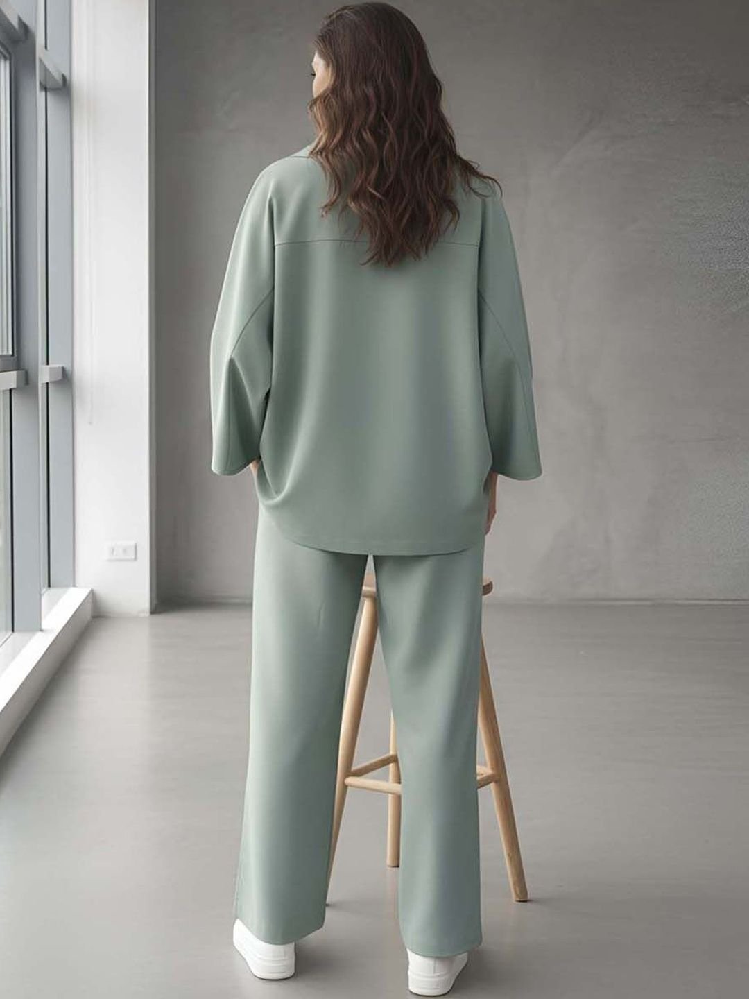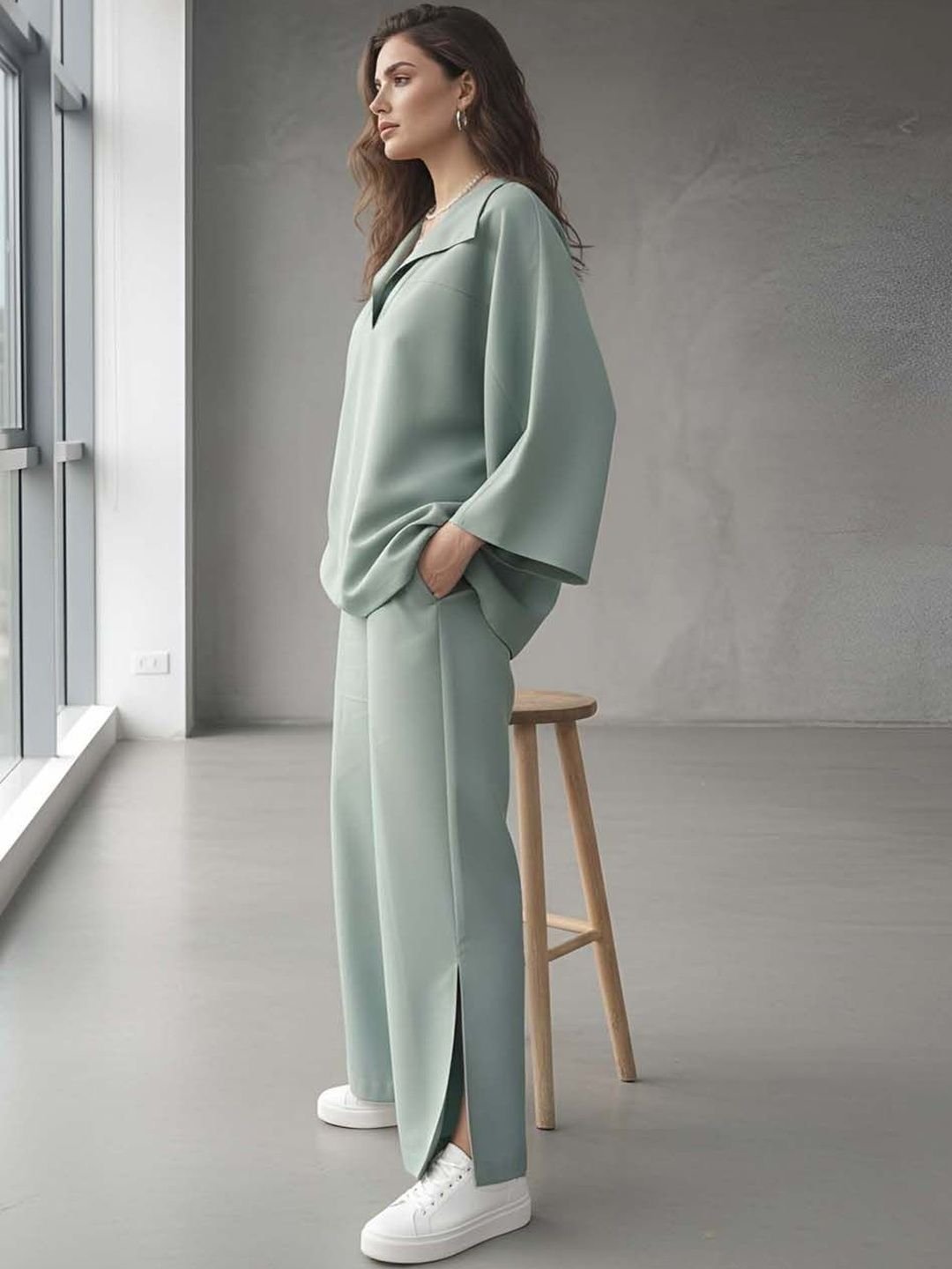 A co-ord set that gets the details right without overcomplicating anything. The sea green linen chex is a fabric choice that earns its keep — breathable, structured, and crisp even after washing. The curved hem on the top adds feminine shape to an otherwise solid, oversized silhouette, and the scalloped hemline on the trousers is the quiet detail that makes the bottom half as considered as the top. V-neck, three-quarter sleeves, slip-on waist — everything simplified for a casual but deliberate everyday look.
