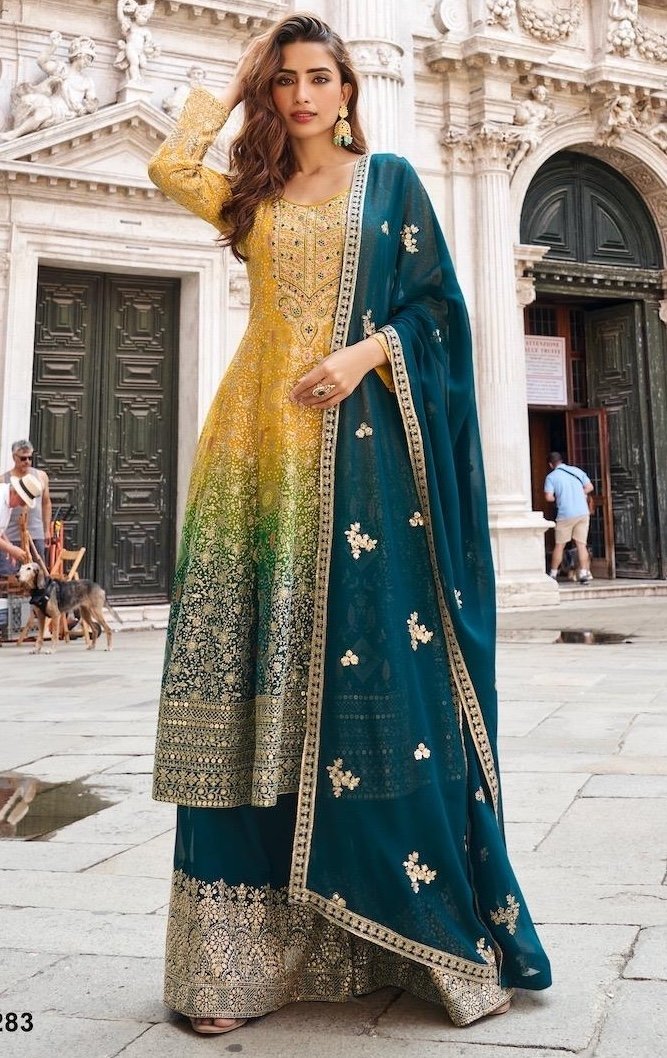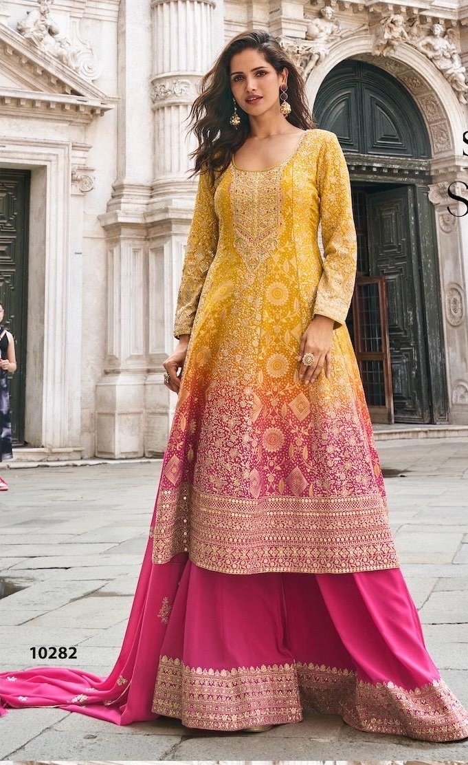Fabric – Viscose Position Jacquard Silk \ Real Georgette ( Festive Shaded Vicose Jacquard Silk On Position Printing Top With Embroidered Sharara And Dupatta )