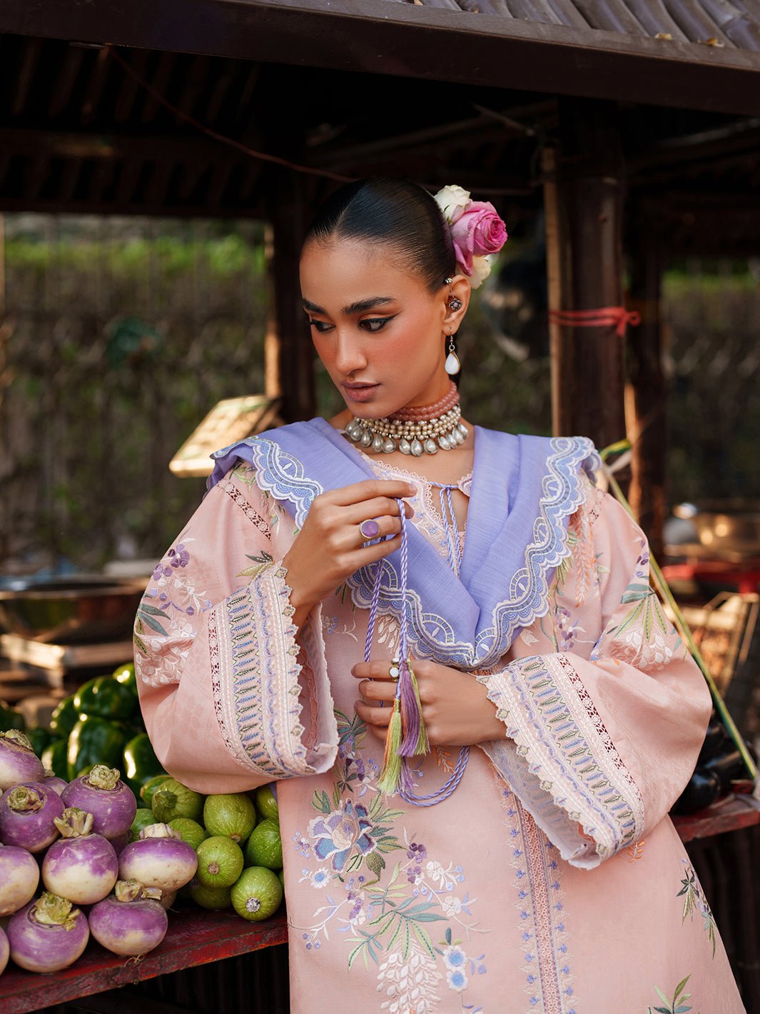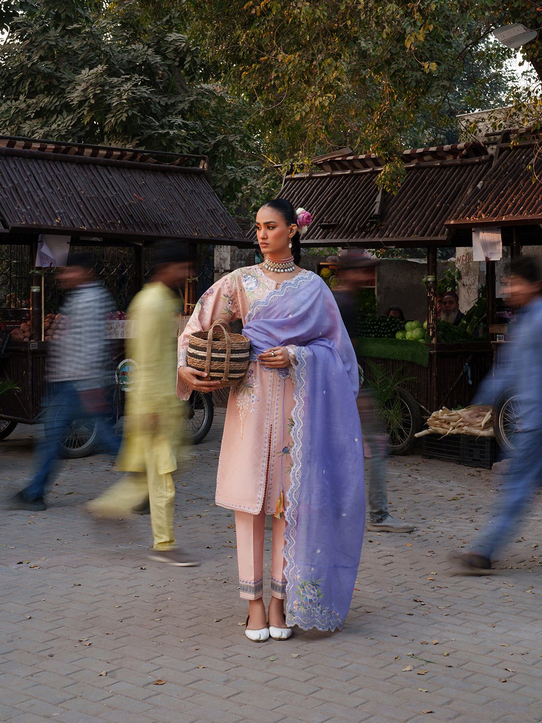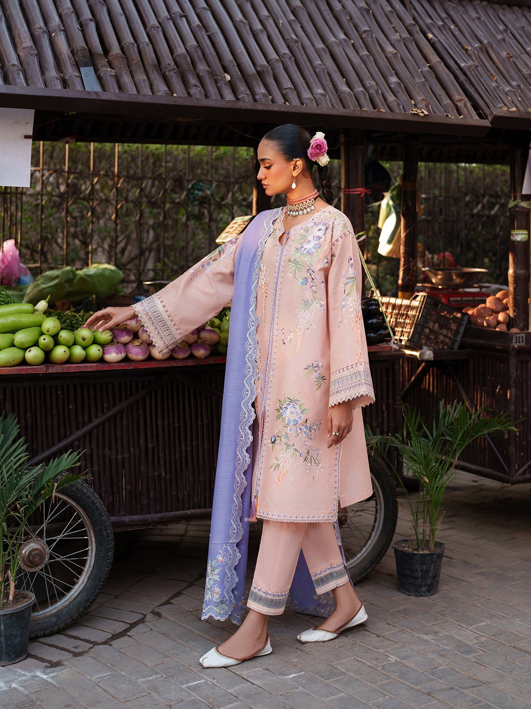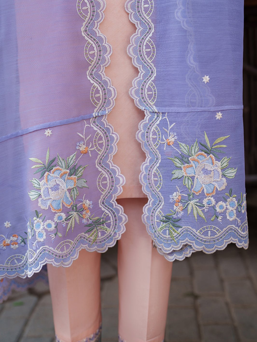 A graceful embroidered organza trouser lace adds dimension and festivity to the bottom, while the dyed cotton trouser provides ease and comfort for long Eid days. The ensemble is crowned with a luxurious cotton-mix dupatta — embroidered at the center and finished with detailed pallus on both ends.