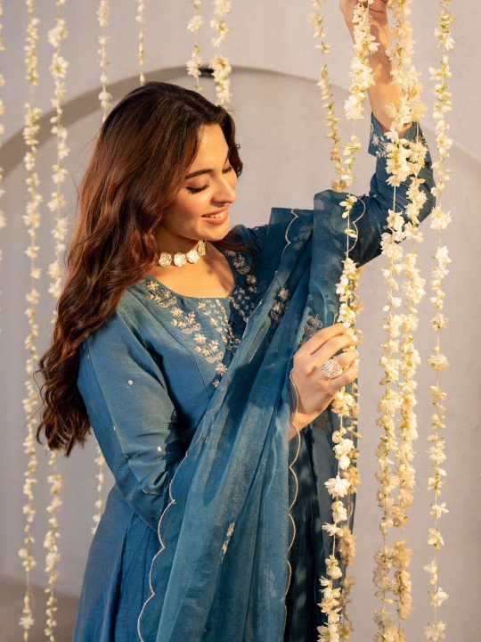 The kurta is designed in a panelled Anarkali style, creating a beautifully structured silhouette with a dramatic flared hemline that flows magnificently at calf length. A sophisticated V-neckline and elegant long regular sleeves complete a look that is both traditional and timelessly chic. Paired with solid silk blend trousers featuring an elasticated waistband and slip-on ease for all-day comfort without compromise. The ensemble is crowned with an embroidered organza dupatta with a solid border — its sheer, gossamer quality adding an ethereal, luminous finishing touch that elevates the entire look.