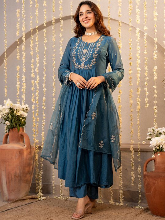 Teal Ethnic Motif Embroidered Silk Blend Anarkali Kurta With Trousers & Organza Dupatta | Panelled Hand Work 3-Piece Set