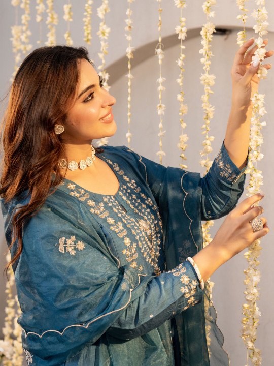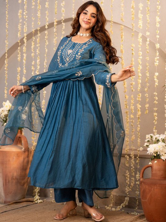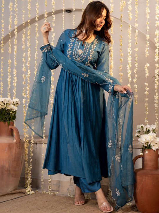 Step into celebrations with breathtaking artisan elegance in this teal ethnic motif embroidered silk blend Anarkali kurta set. The calf-length Anarkali kurta is masterfully crafted in premium silk blend fabric, delivering a rich, lustrous sheen and graceful drape that moves beautifully with every step. What makes this piece truly extraordinary is the combination of machine embroidery and hand work — intricate ethnic motifs are placed at the yoke and border, bringing a level of craftsmanship and detail that is rare in ready-to-wear fashion.