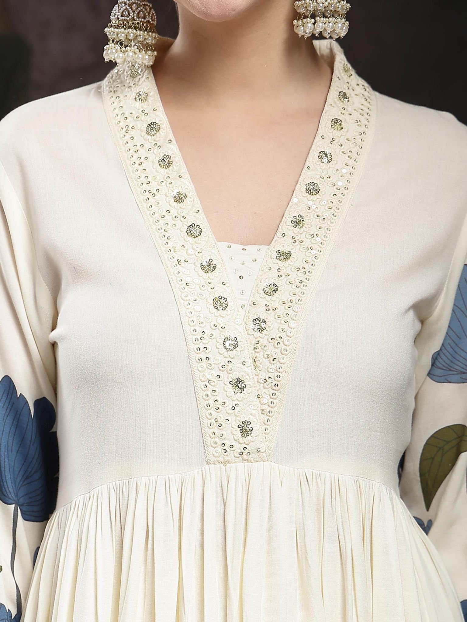 A-Line floral kurta with V-neck, full sleeves & sequin embellishments