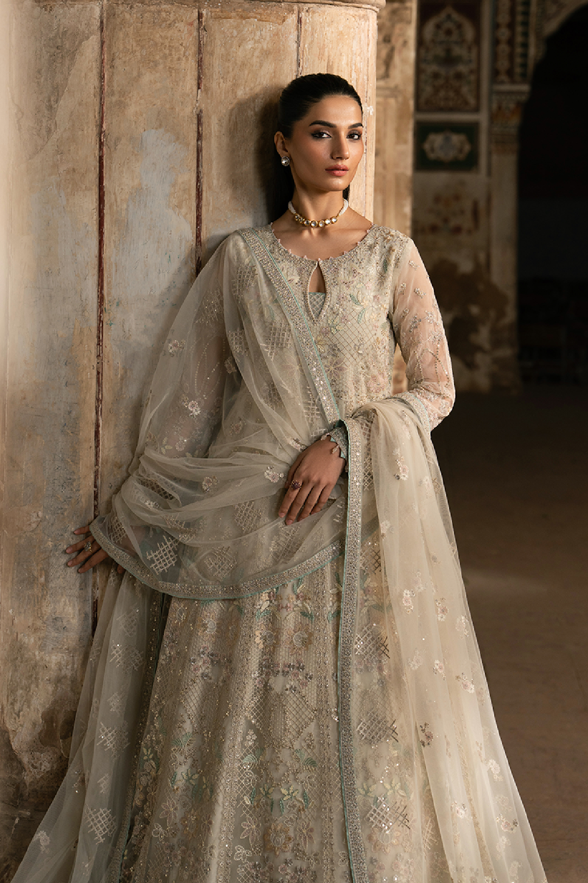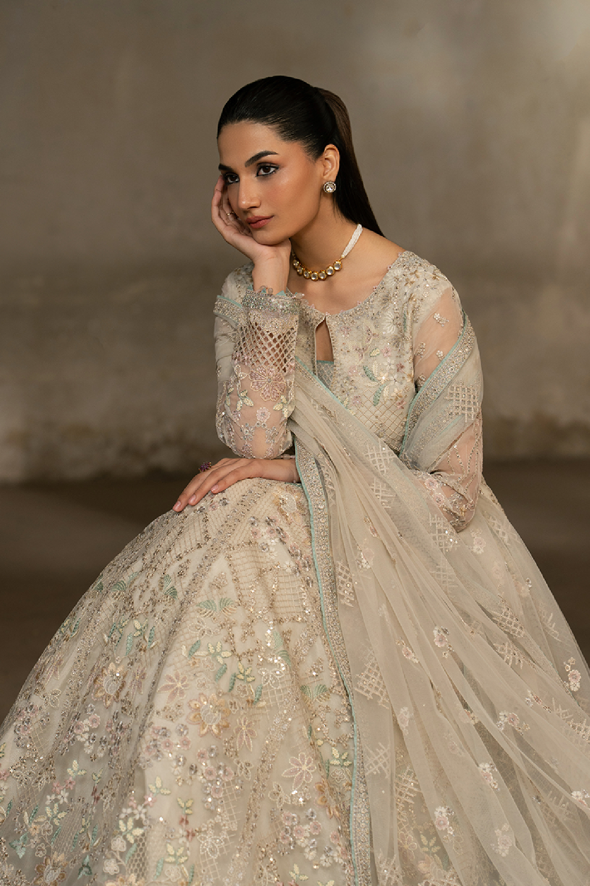 A show-stopping Embroidered Bareeze Net Dupatta in pristine white dove that drapes magnificently, adding an extra dimension of bridal elegance, softness, and grace to your overall look. The intricate embroidery across the dupatta makes it an extraordinary statement piece — one that beautifully frames your face and completes the ensemble with unparalleled refinement.