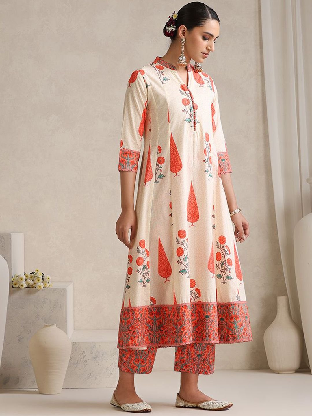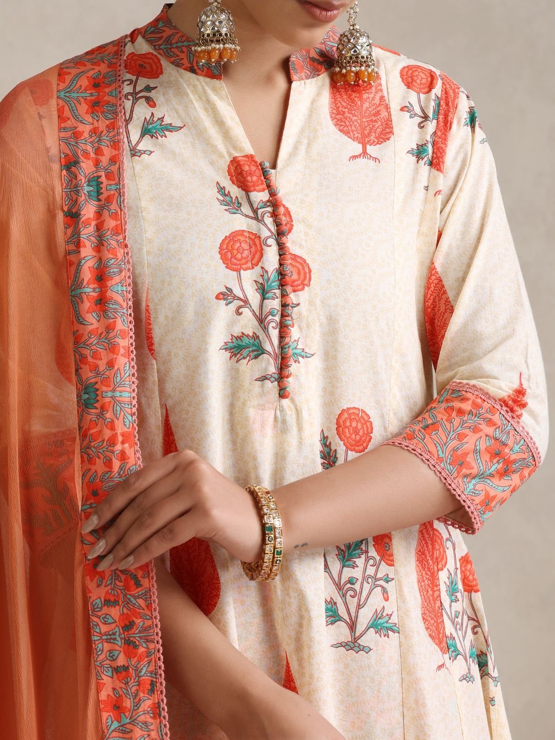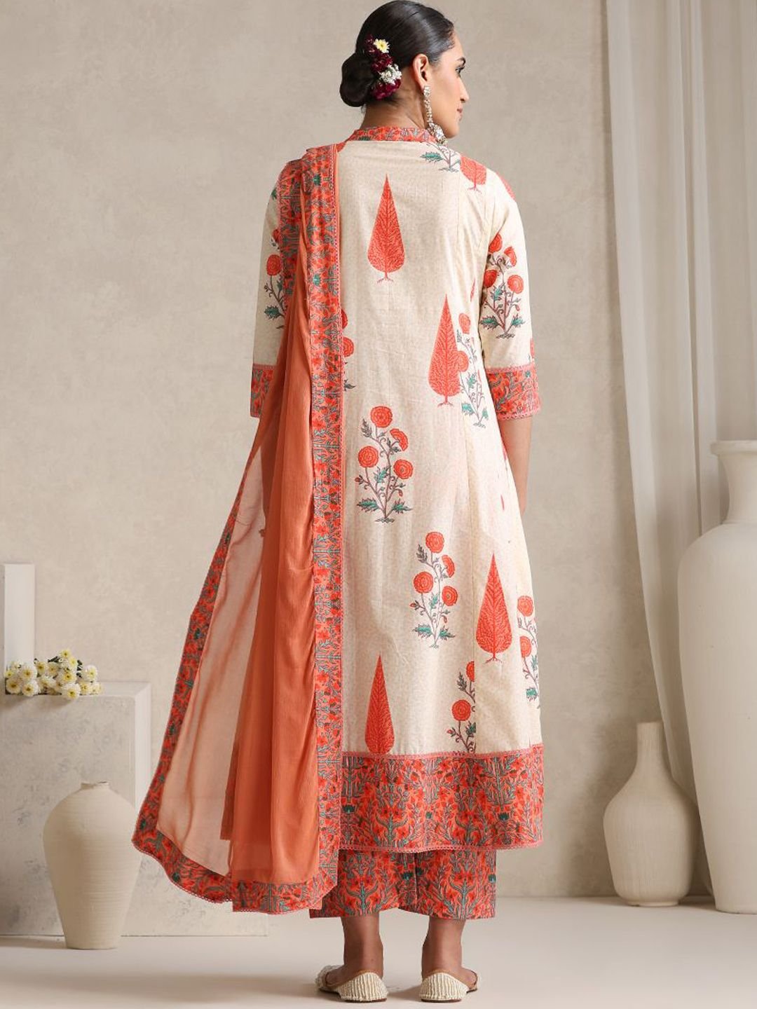 White with a large-coverage floral print is a pairing that works across occasions without overthinking it — fresh enough for a casual family gathering, considered enough for a mehndi function or Eid morning. The mandarin collar and three-quarter sleeves give the straight kurta its shape, the calf-length hem provides full coverage, and the printed palazzo with elasticated waist keeps the lower half practical. The solid chiffon dupatta brings a lightness in fabric contrast that the cotton body below earns.