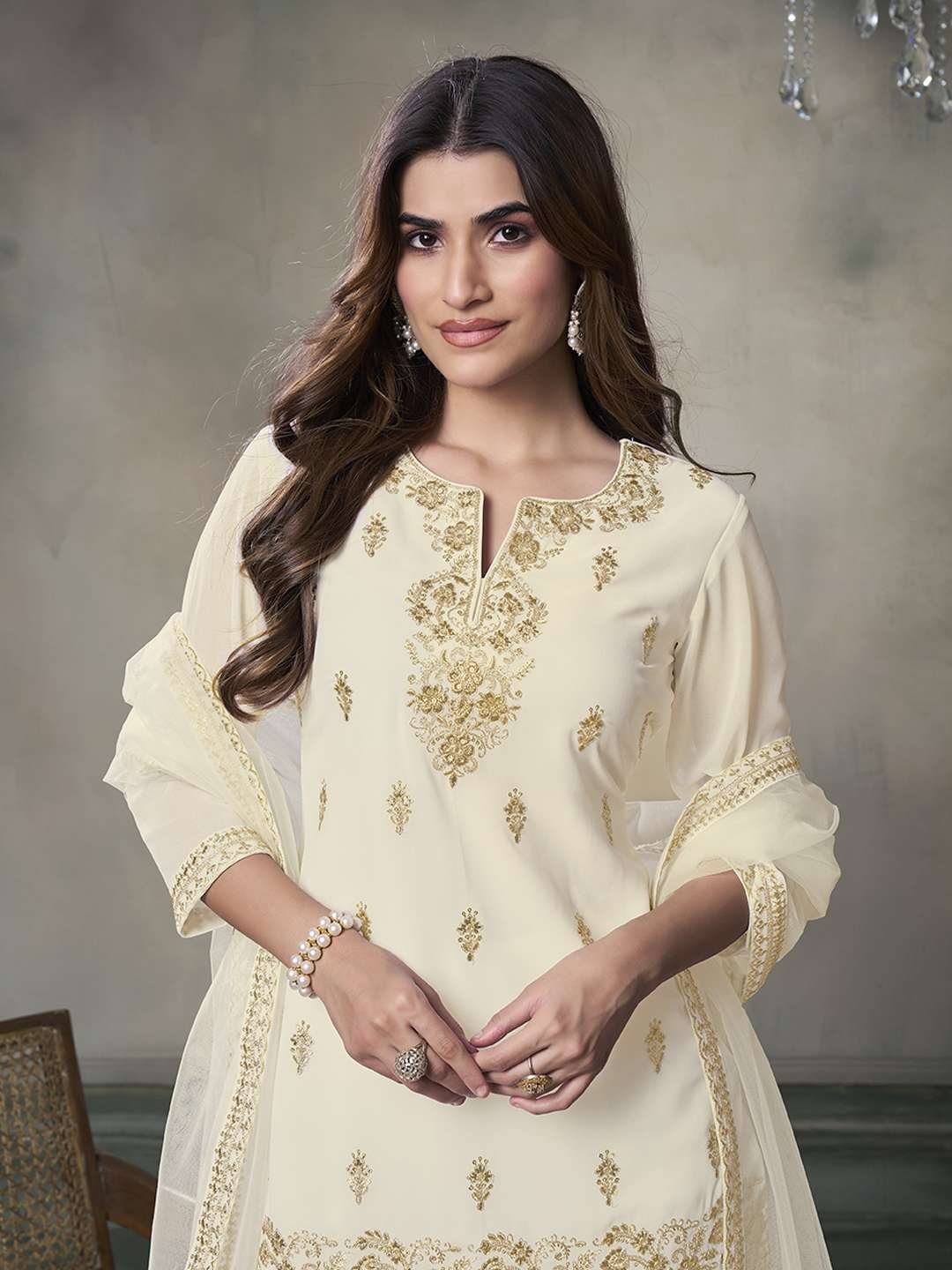 Upgrade your wardrobe with this breathtaking white floral zari sequinned embroidered georgette kurta set — a stunning 3-piece ensemble that redefines festive dressing. The beautifully embroidered white kurta is crafted in premium georgette fabric, renowned for its soft, fluid drape and elegant fall, and is fully lined with a crepe inner for a structured, polished finish that moves gracefully with every step. The intricate floral zari and sequin embroidery catch the light magnificently, creating a dazzling effect that commands attention at every celebration.