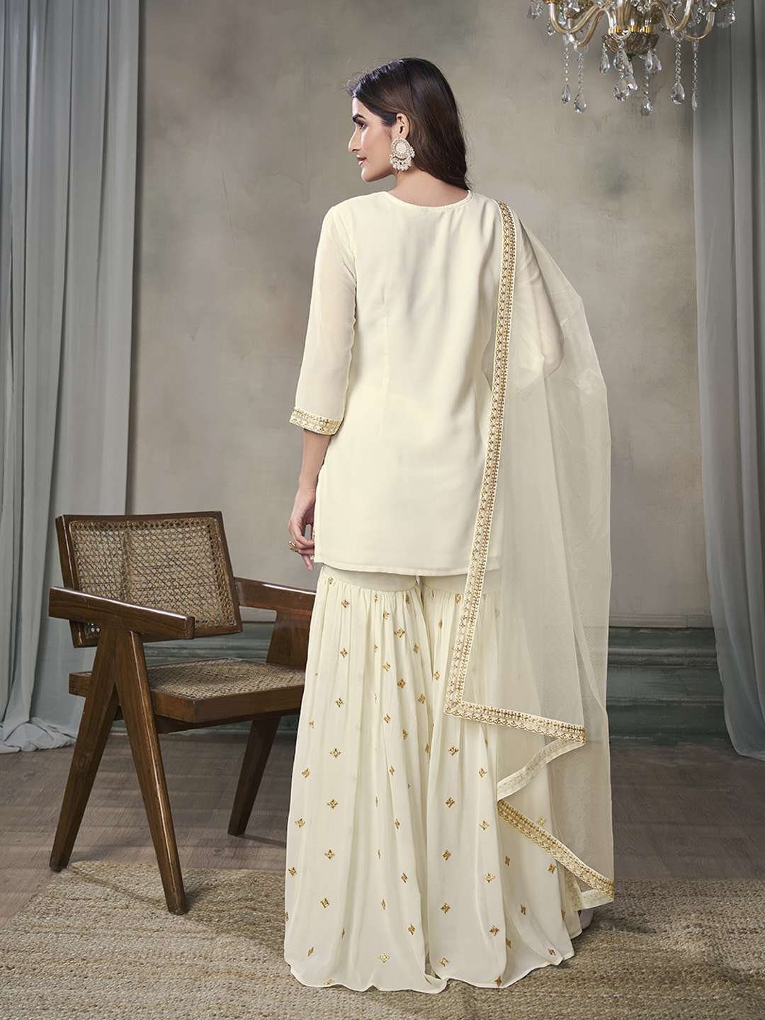 White Embroidered Kurta Set Floral Zari Work Sequin Embroidery Georgette Kurta Sharara Set Net Dupatta Crepe Lined Round Neck Straight Kurta 3-Piece Set Wedding Wear Festive Wear