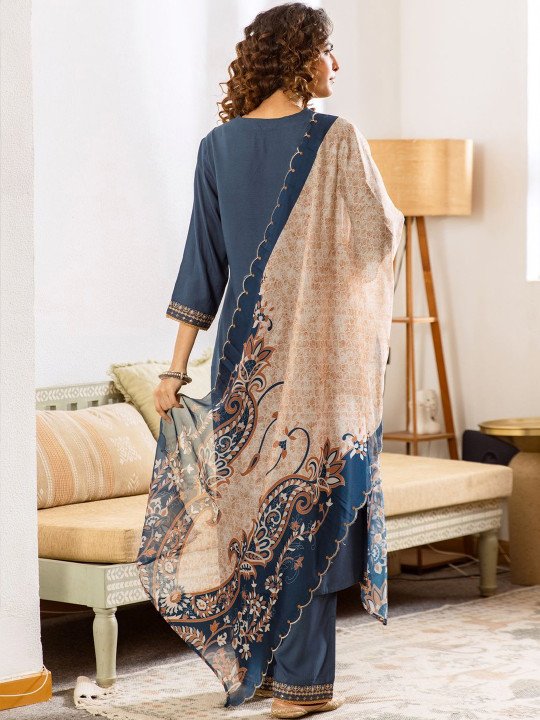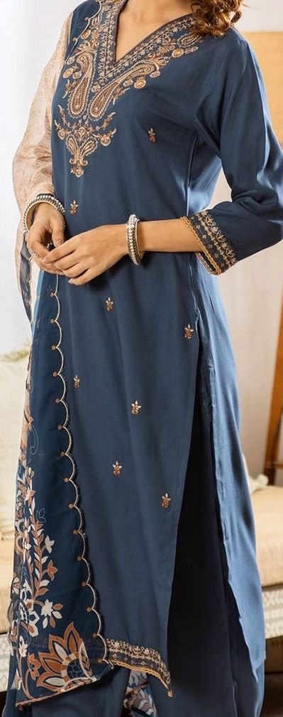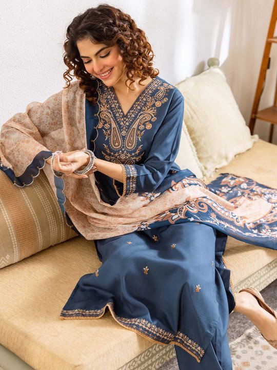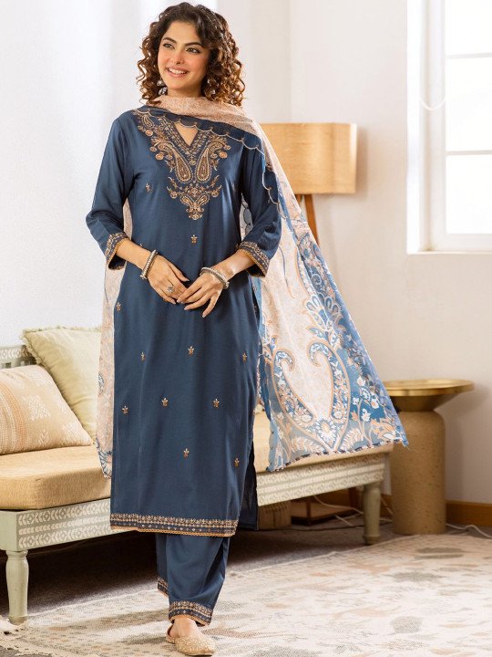 Elevate your ethnic wardrobe with this stunning Blue Embroidered Kurta Set — a thoughtfully crafted three-piece ensemble that blends traditional artistry with everyday elegance. The kurta features delicate ethnic motif thread work embroidery at the yoke and border, set against a soft viscose rayon fabric that drapes effortlessly and keeps you comfortable all day long.
