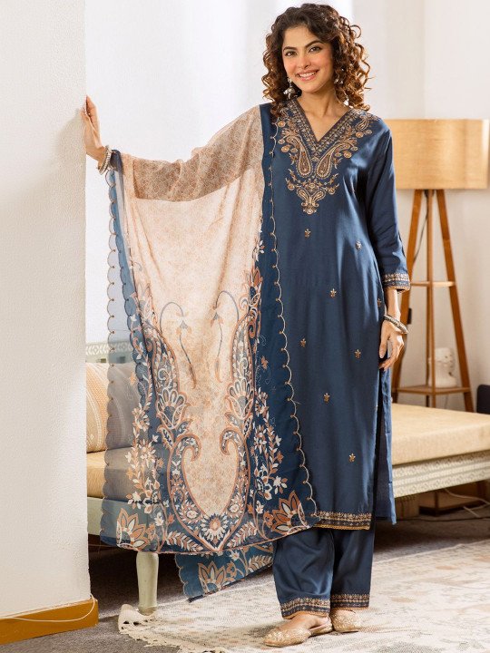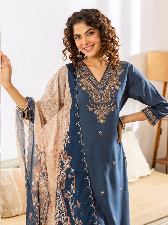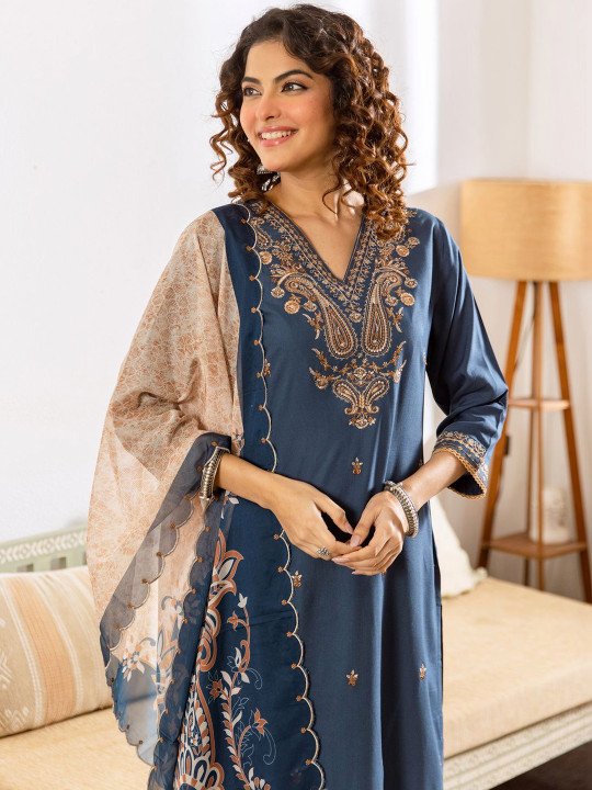 blue embroidered kurta with trousers and dupattaethnic motif thread work kurta set onlinestraight cut kurta with elasticated trouserwomen’s ethnic three-piece set with dupattaviscose rayon kurta for festival season