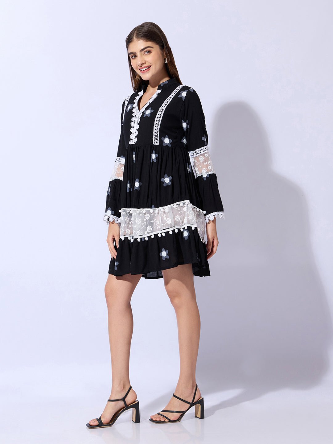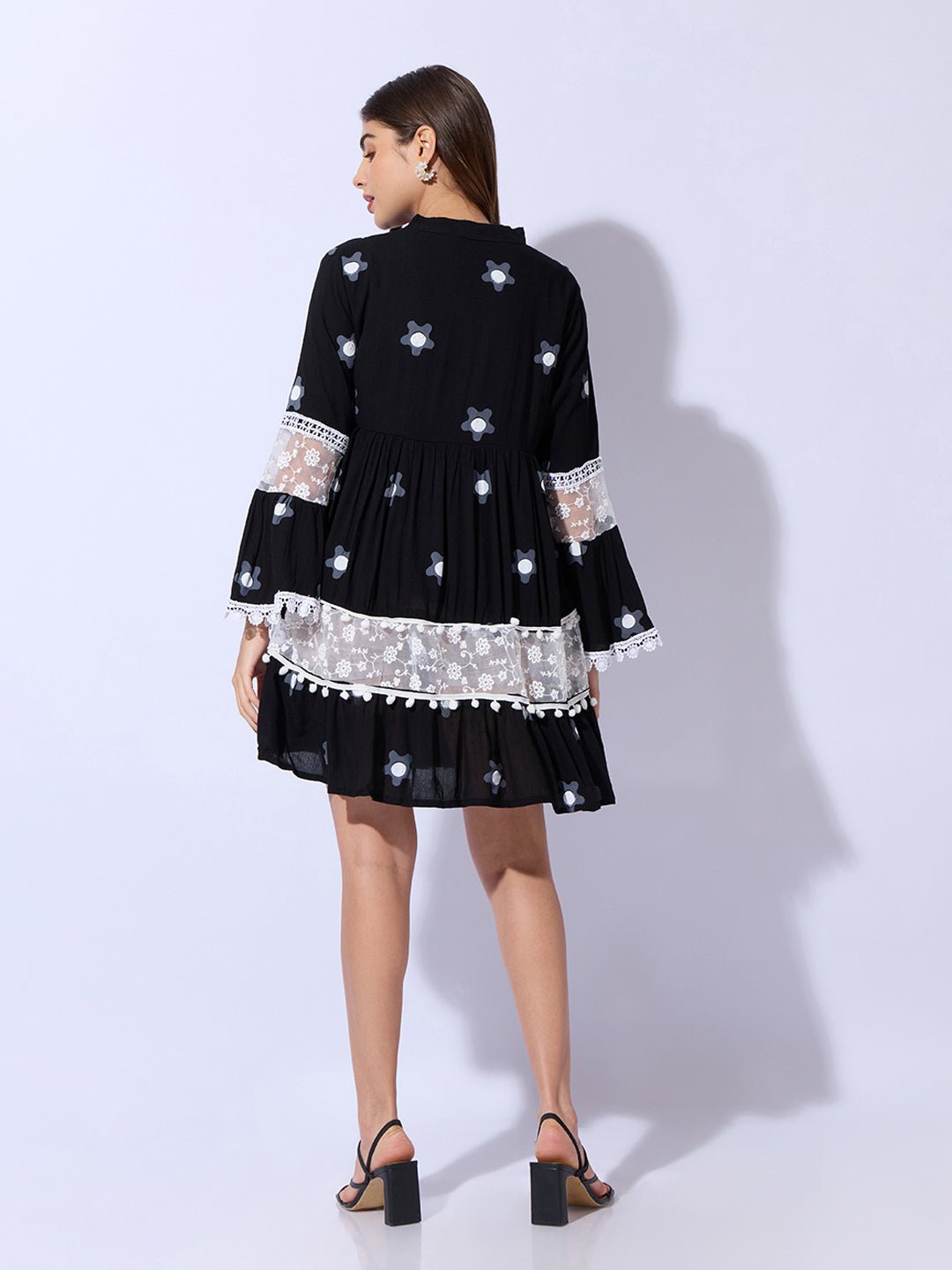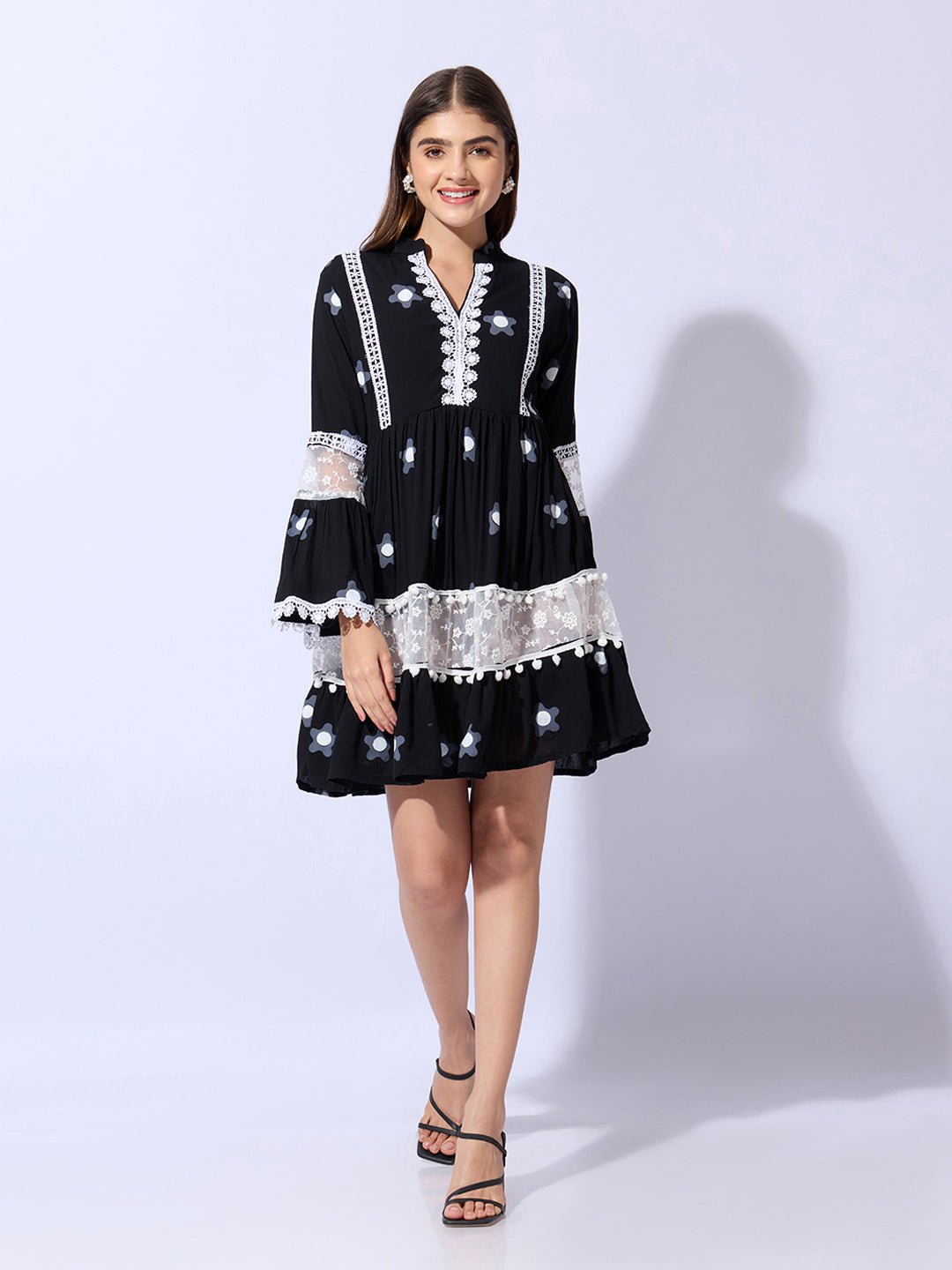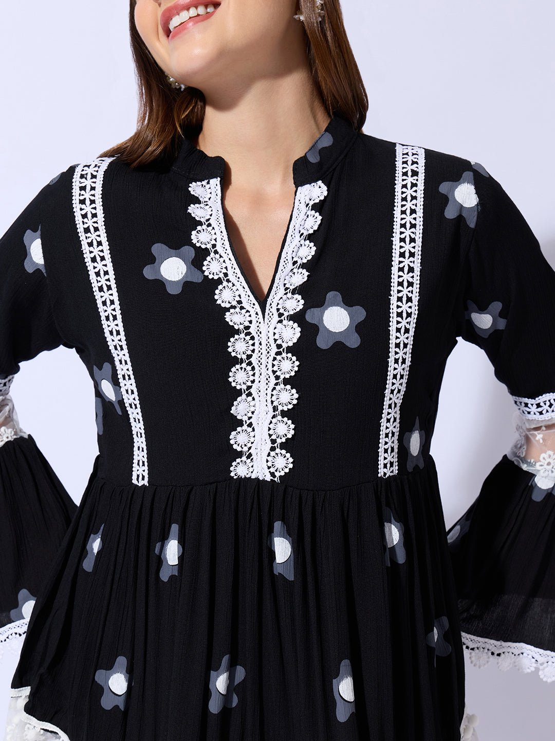 Black is the canvas that lets everything else on a garment take centre stage — and this longline top uses that quality with intention. The floral print sits against the dark ground with a femininity that wouldn’t read the same way on lighter fabric, the bell sleeves add a silhouette element that elevates it beyond a basic top, and the lace inserts bring a textural contrast that makes this genuinely considered rather than simply printed. The mandarin collar grounds the neckline architecturally, and the opaque cotton construction ensures a flattering silhouette whatever you pair it with.