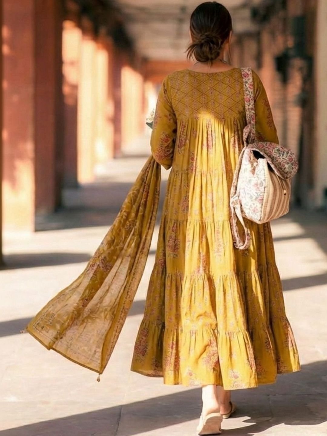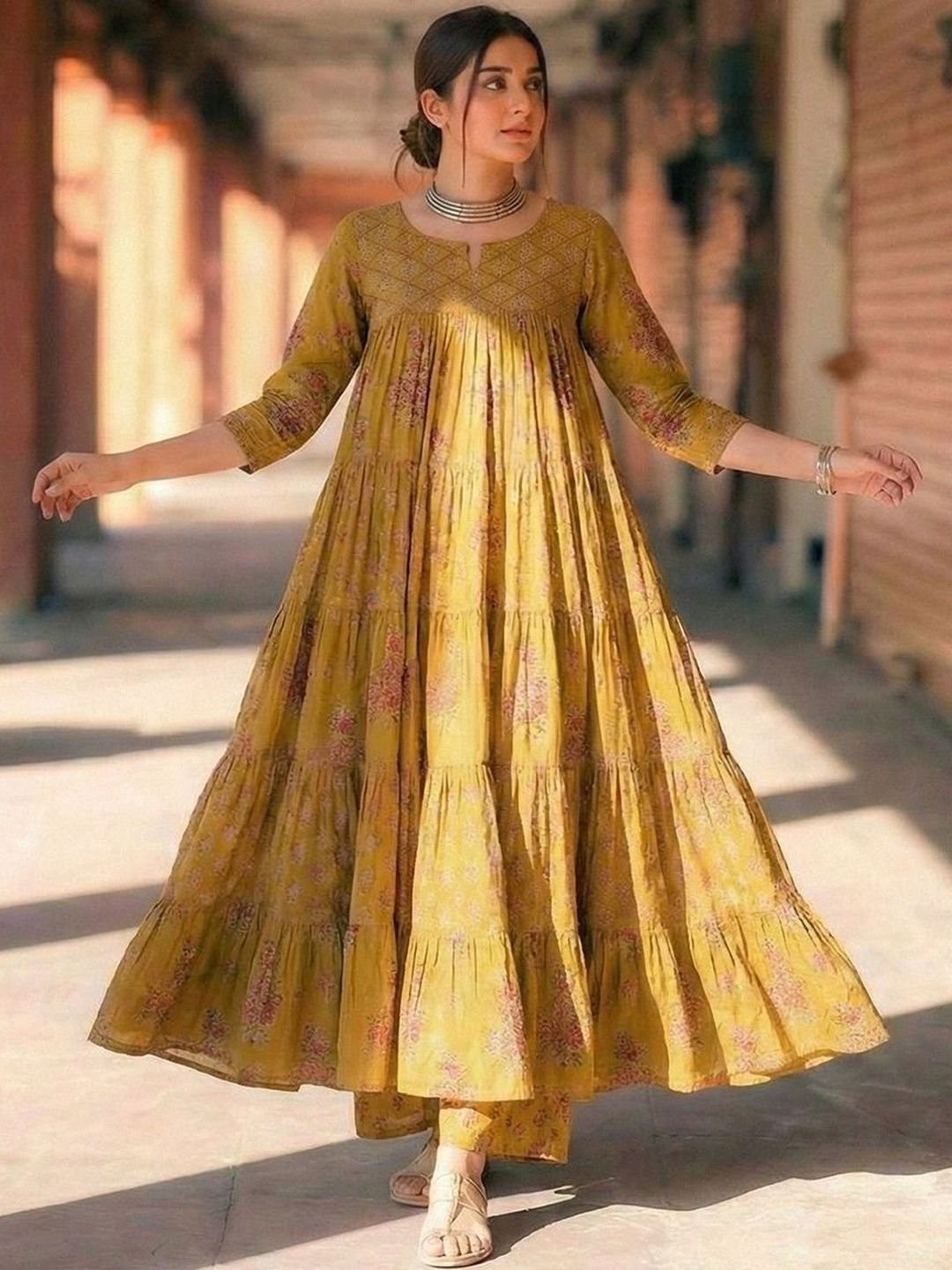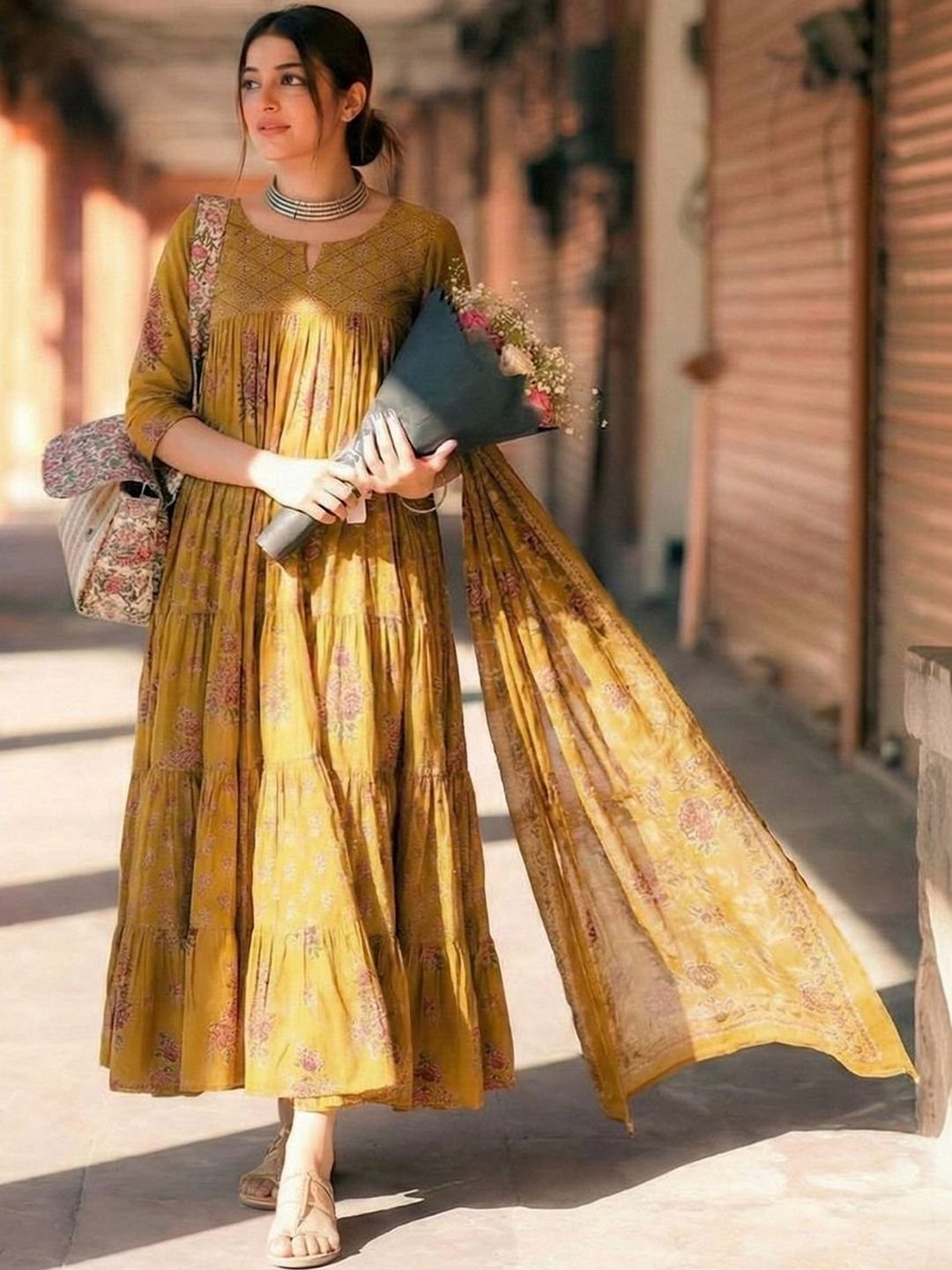 Yellow floral printed viscose rayon is the fabric and colour combination that consistently works for daytime festive occasions — the rayon’s soft drape lets the print breathe, and yellow in a small floral pattern reads vivid without being loud. The tiered silhouette elevates this beyond a standard printed kurta, adding movement and volume at the calf-length hem. Round neck, three-quarter sleeves, no pockets — the construction stays clean so the print and tier do the work. The printed palazzo and printed dupatta complete the three-piece.