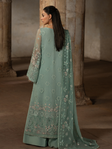 Light Aqua Embroidered Chiffon Three-Piece Stitched Collection | Premium Organza Border & Dyed Trouser