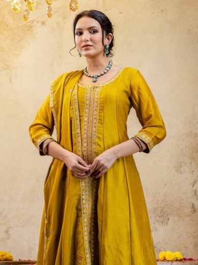 Yellow Angrakha Anarkali Embroidered Silk Blend Kurta Set